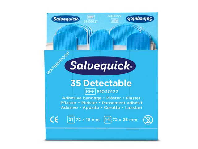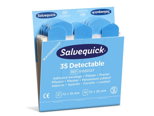 Salvequick Blue Detectable plåster är särskilt avsedda för användning inom livsmedelsindustrin. Plåstren är detekterbara och upptäcks av de flesta metalldetektorer. Den blå färgen gör att plåstren också är lätta att upptäcka visuellt. Plåstren är allergitestade. De är lätta att applicera, flexibla och smidiga att använda.Salvequick Blue Detectable refill passar i Salvequick Plåsterautomat och Wound Care Dispenser. Salvequick Plåster och Plåsterautomater är ett komplett och lättanvänt system. Plåstren finns alltid på plats, färdiga att använda. Innehåll: Varje refill innehåller 35 plåster (21 st 72x19mm och 14 st 72x25mm) 6 refiller/ask