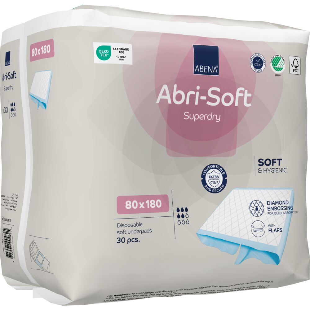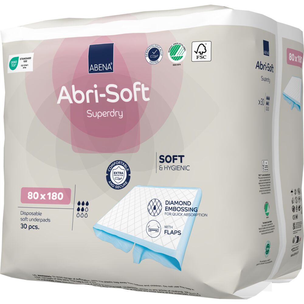 Abena Abri-Soft Superdry används som ett skyddande engångsunderlag för till exempel sängar och stolar. Det är lämpligt för inkontinenta användare, men också för icke-sterila moment. Underlägget innehåller både fluff och SAP, vilket hjälper till att kapsla vätskan och ger en torr yta snabbare. Odörsystemet minimerar oönskad lukt. Dessutom har underlägget förseglade kanter för optimalt skydd mot läckage, och ytan är täckt med ett mjuk nonwoven som säkerställer att användaren har det bekvämt. Användningen av engångsunderlägg minskar risken för kontaminering. Finns med och utan bäddflikar. Underlägget med bäddflikar kan med fördel användas för aktiva eller oroliga användare, eftersom underlägget inte rör sig. Abena Abri-Soft Superdry har lätt till måttlig absorptionsförmåga och finns i olika storlekar.