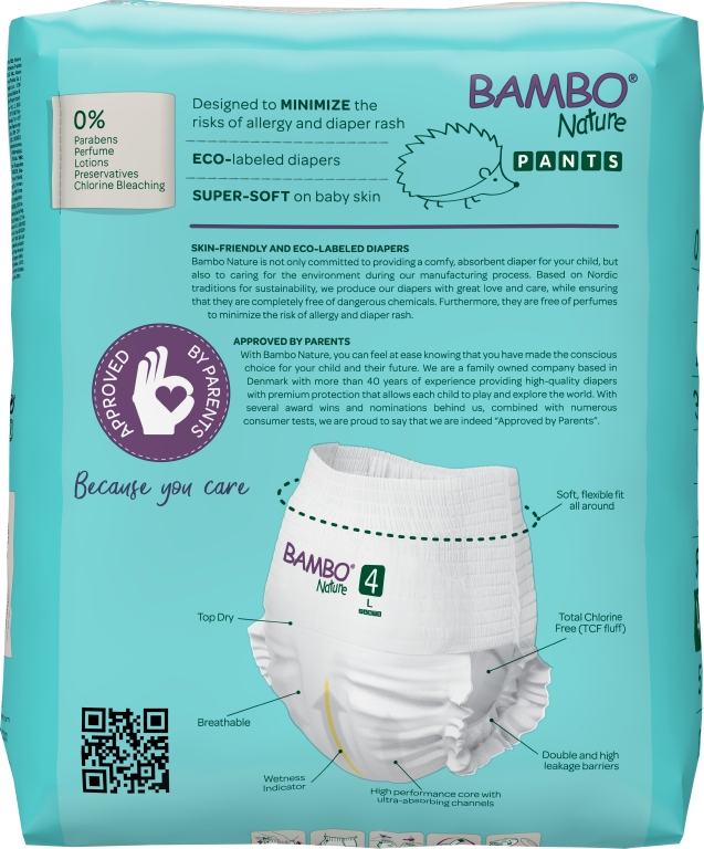 Bambo Nature är inte bara bekväm och absorberande för ditt barn utan också en miljövänlig blöja. Baserat på nordiska traditioner för hållbarhet producerar vi blöjor med miljövänliga tillverkningsprocesser, samtidigt som vi säkerställer att de är fria från farliga kemikalier och parfymer för att minimera risken för allergi och blöjutslag. Blöjan är FSC, Svanen och Astmaallergimärkt. Utöver det är den dermatologiskt testad. Bambo Nature - Eftersom du bryr dig.