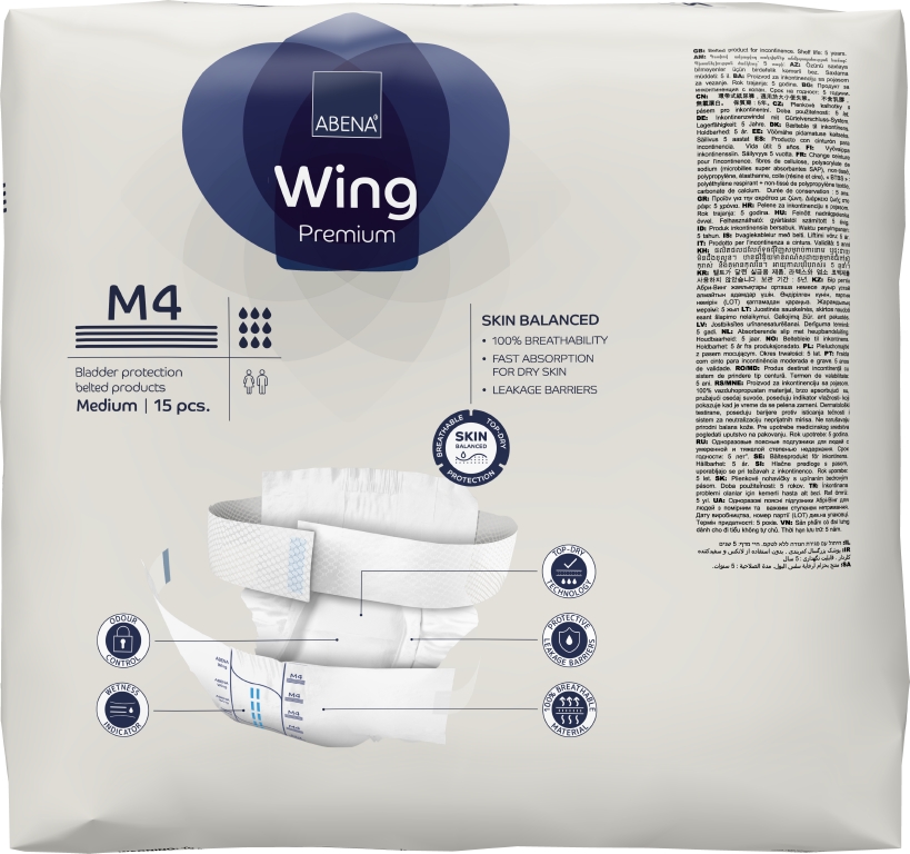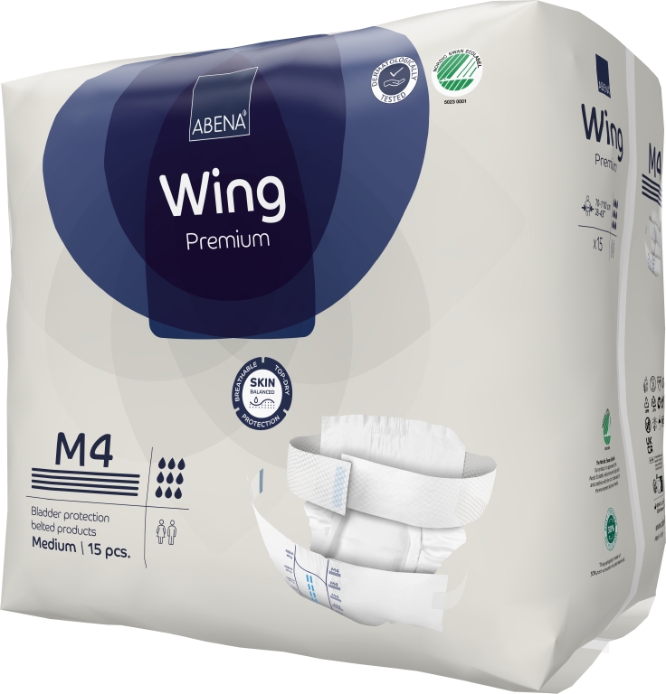 ABENA Wing är vårt förstklassiga sortiment av bältesprodukter för måttlig till kraftig inkontinens. Samtliga produkter är Svanenmärkta. Alla inkontinensprodukter har full andningsförmåga och är utrustade med läckagebarriärer för extra skydd. De dermatologiskt testade produkterna med ABENA:s Top-Dry-teknik skyddar och vårdar huden genom att hålla det exponerade området torrt och behagligt även efter flera läckage. Det mjuka nonwoven-bältet är integrerat i produktens baksida och erbjuder en bra fixeringslösning för alla kroppsformer. Bältet är extra långt, så du behöver inte använda något separat förlängningsbälte. Optimal passform tack vare resårer i både fram- och baksidan. Lättjusterade fästen (kardborreband på bältet och kombitejp på produkten) som kan flyttas flera gånger. Den unika passformen gör ABENA Wing till en utmärkt lösning för vårdtagare som kan klara sig själva. Med hjälp av våtindikatorn och rutsystemet kan användare och vårdgivare hitta den produkt som har rätt absorptionsnivå, vilket också underlättar vid byten. Odörsystemet minskar risken för oönskad lukt.