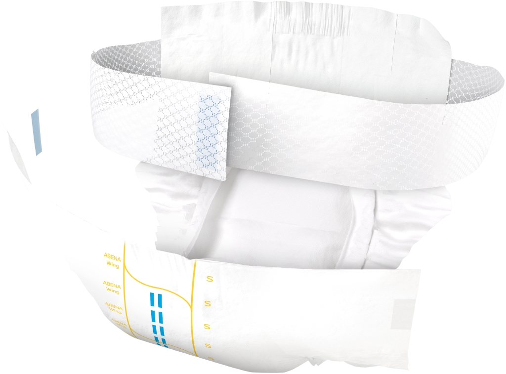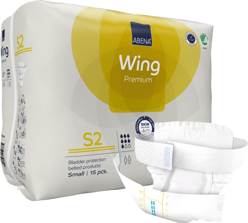 ABENA Wing är vårt förstklassiga sortiment av bältesprodukter för måttlig till kraftig inkontinens. Samtliga produkter är Svanenmärkta. Alla inkontinensprodukter har full andningsförmåga och är utrustade med läckagebarriärer för extra skydd. De dermatologiskt testade produkterna med ABENA:s Top-Dry-teknik skyddar och vårdar huden genom att hålla det exponerade området torrt och behagligt även efter flera läckage. Det mjuka nonwoven-bältet är integrerat i produktens baksida och erbjuder en bra fixeringslösning för alla kroppsformer. Bältet är extra långt, så du behöver inte använda något separat förlängningsbälte. Optimal passform tack vare resårer i både fram- och baksidan. Lättjusterade fästen (kardborreband på bältet och kombitejp på produkten) som kan flyttas flera gånger. Den unika passformen gör ABENA Wing till en utmärkt lösning för vårdtagare som kan klara sig själva. Med hjälp av våtindikatorn och rutsystemet kan användare och vårdgivare hitta den produkt som har rätt absorptionsnivå, vilket också underlättar vid byten. Odörsystemet minskar risken för oönskad lukt.
