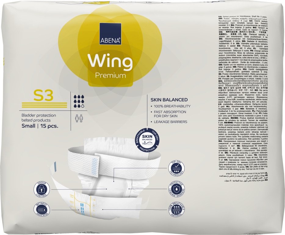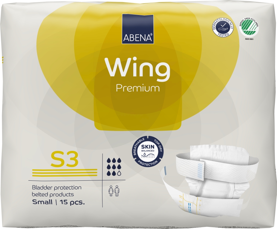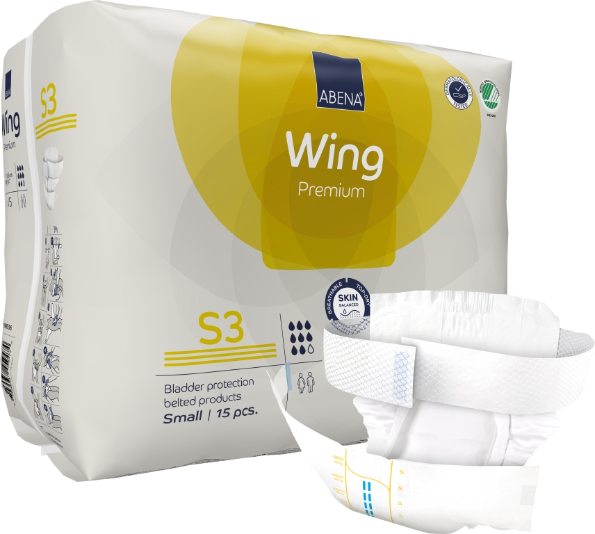 ABENA Wing är vårt förstklassiga sortiment av bältesprodukter för måttlig till kraftig inkontinens. Samtliga produkter är Svanenmärkta. Alla inkontinensprodukter har full andningsförmåga och är utrustade med läckagebarriärer för extra skydd. De dermatologiskt testade produkterna med ABENA:s Top-Dry-teknik skyddar och vårdar huden genom att hålla det exponerade området torrt och behagligt även efter flera läckage. Det mjuka nonwoven-bältet är integrerat i produktens baksida och erbjuder en bra fixeringslösning för alla kroppsformer. Bältet är extra långt, så du behöver inte använda något separat förlängningsbälte. Optimal passform tack vare resårer i både fram- och baksidan. Lättjusterade fästen (kardborreband på bältet och kombitejp på produkten) som kan flyttas flera gånger. Den unika passformen gör ABENA Wing till en utmärkt lösning för vårdtagare som kan klara sig själva. Med hjälp av våtindikatorn och rutsystemet kan användare och vårdgivare hitta den produkt som har rätt absorptionsnivå, vilket också underlättar vid byten. Odörsystemet minskar risken för oönskad lukt.