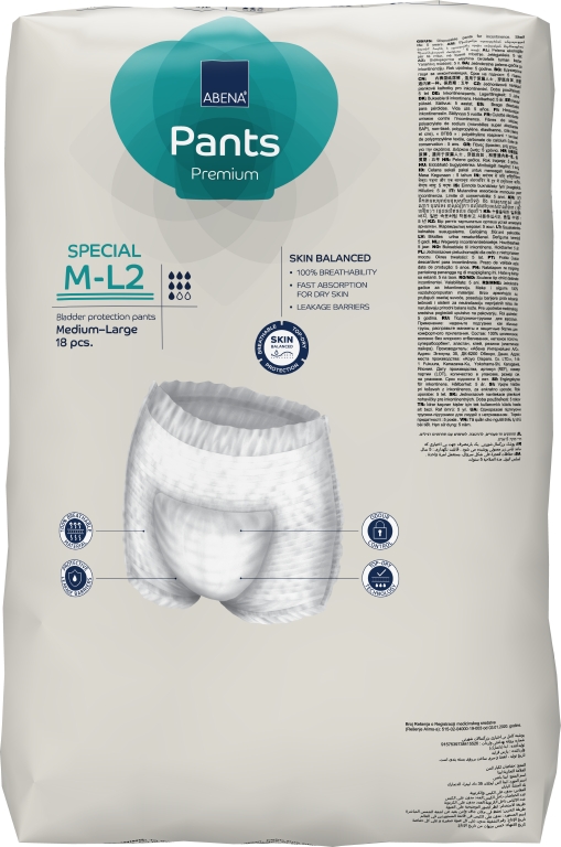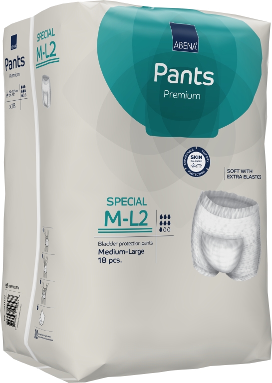 ABENA Pants Special är vårt förstklassiga sortiment av engångsbyxor som kan användas som vanliga underkläder vid måttlig inkontinens. Produkterna har ben och unik elasticitet i både ben- och grenområdet, vilket ger perfekt passform vid fysiska aktiviteter. De är försedda med vårt Top Dry-system som gör dem så behagliga och skonsamma mot huden som möjligt. Byxorna har en modern design, är tillverkade i ett material med hög andningsförmåga och försedda med läckagebarriärer för extra skydd. Tillsammans hjälper dessa funktioner till att skydda huden och bibehålla naturlig pH-balans i huden. De elastiska trådarna ger säker och bekväm passform och odörsystemet minimerar oönskad lukt.