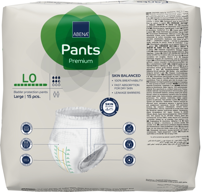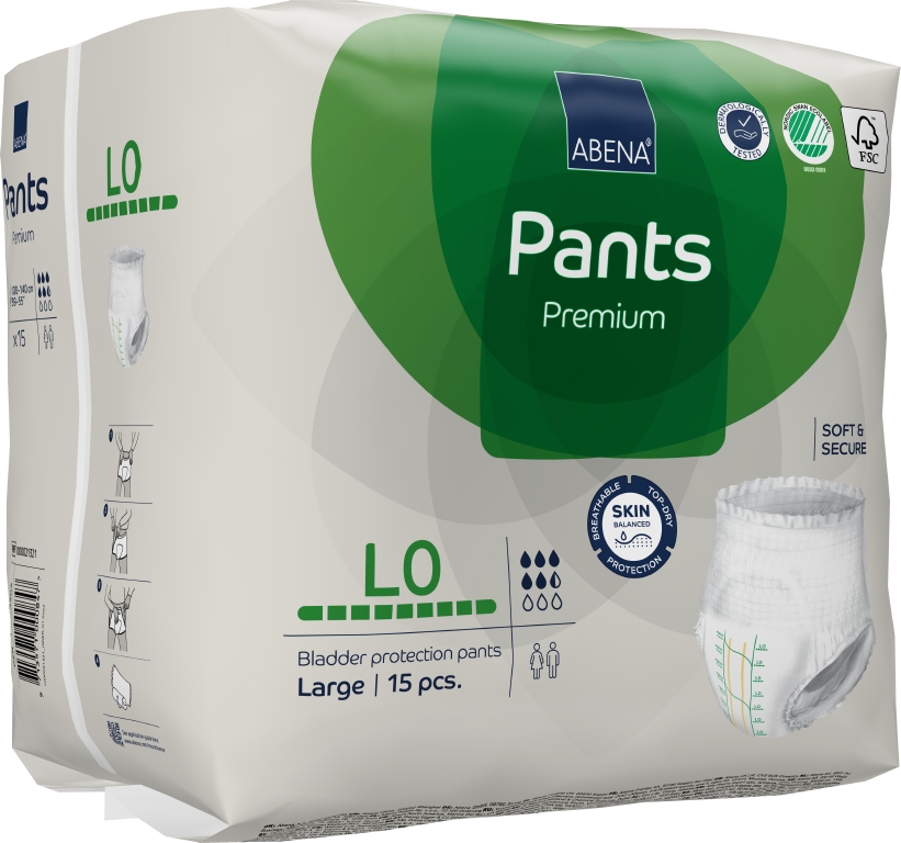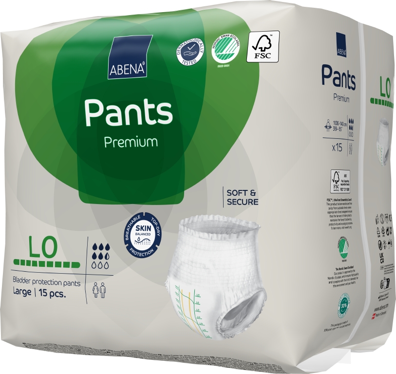 ABENA Pants är vårt förstklassiga utbud av engångsbyxor som kan bäras som vanliga underkläder, med absorptionsnivåer anpassade till en rad olika behov. Produkterna är tillverkade i extra mjukt material med hög andningsförmåga för bekväm användning. Midjeresåren med ett stort antal lycratrådar ger säker och åtsittande passform, så byxan passar utmärkt till en aktiv livsstil. Den högeffektiva kärnan med Top-Dry-teknik skyddar och vårdar huden genom att hålla det exponerade området torrt och behagligt även efter flera läckage. Kombinationen av läckagebarriärer (längs- och tvärgående barriärer) och resårer ger 360-graders läckageskydd runt hela produkten. Tillsammans hjälper dessa funktioner till att skydda huden och bibehålla naturlig pH-balans i huden. Odörsystemet minskar risken för oönskad lukt. Med hjälp av våtindikatorn och rutsystemet (förutom i storlek XS1) kan användaren och vårdgivaren hitta den produkt som har rätt absorptionsnivå, vilket underlättar även vid byten.