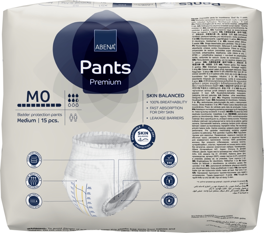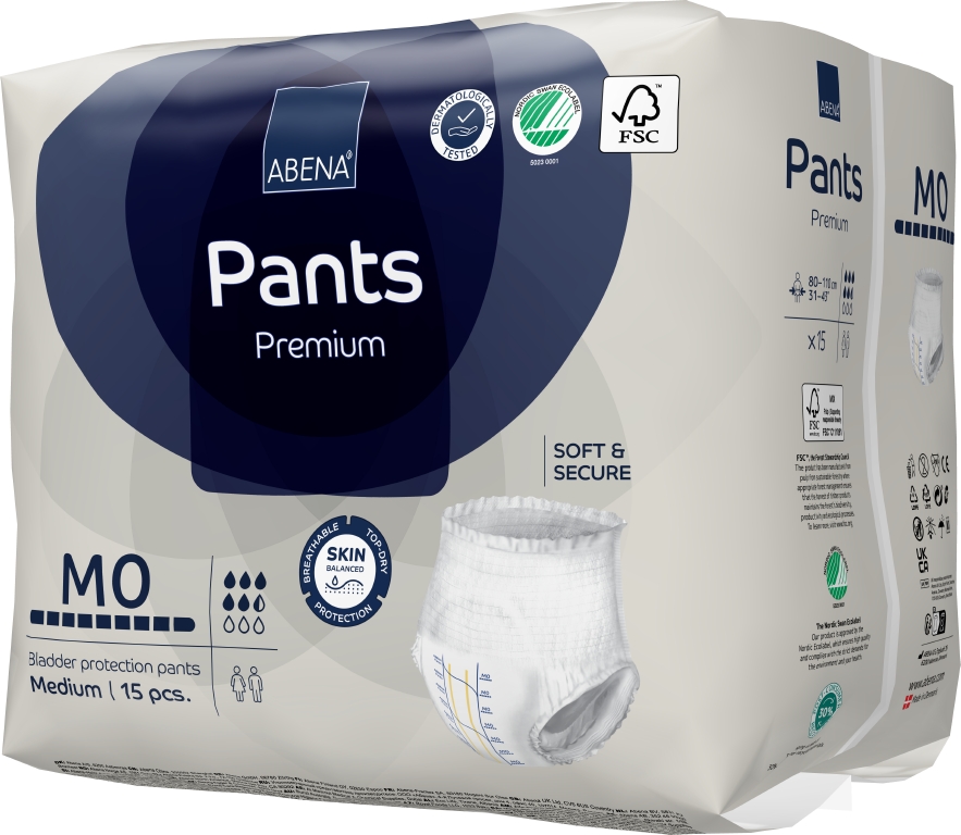 ABENA Pants är vårt förstklassiga utbud av engångsbyxor som kan bäras som vanliga underkläder, med absorptionsnivåer anpassade till en rad olika behov. Produkterna är tillverkade i extra mjukt material med hög andningsförmåga för bekväm användning. Midjeresåren med ett stort antal lycratrådar ger säker och åtsittande passform, så byxan passar utmärkt till en aktiv livsstil. Den högeffektiva kärnan med Top-Dry-teknik skyddar och vårdar huden genom att hålla det exponerade området torrt och behagligt även efter flera läckage. Kombinationen av läckagebarriärer (längs- och tvärgående barriärer) och resårer ger 360-graders läckageskydd runt hela produkten. Tillsammans hjälper dessa funktioner till att skydda huden och bibehålla naturlig pH-balans i huden. Odörsystemet minskar risken för oönskad lukt. Med hjälp av våtindikatorn och rutsystemet (förutom i storlek XS1) kan användaren och vårdgivaren hitta den produkt som har rätt absorptionsnivå, vilket underlättar även vid byten.