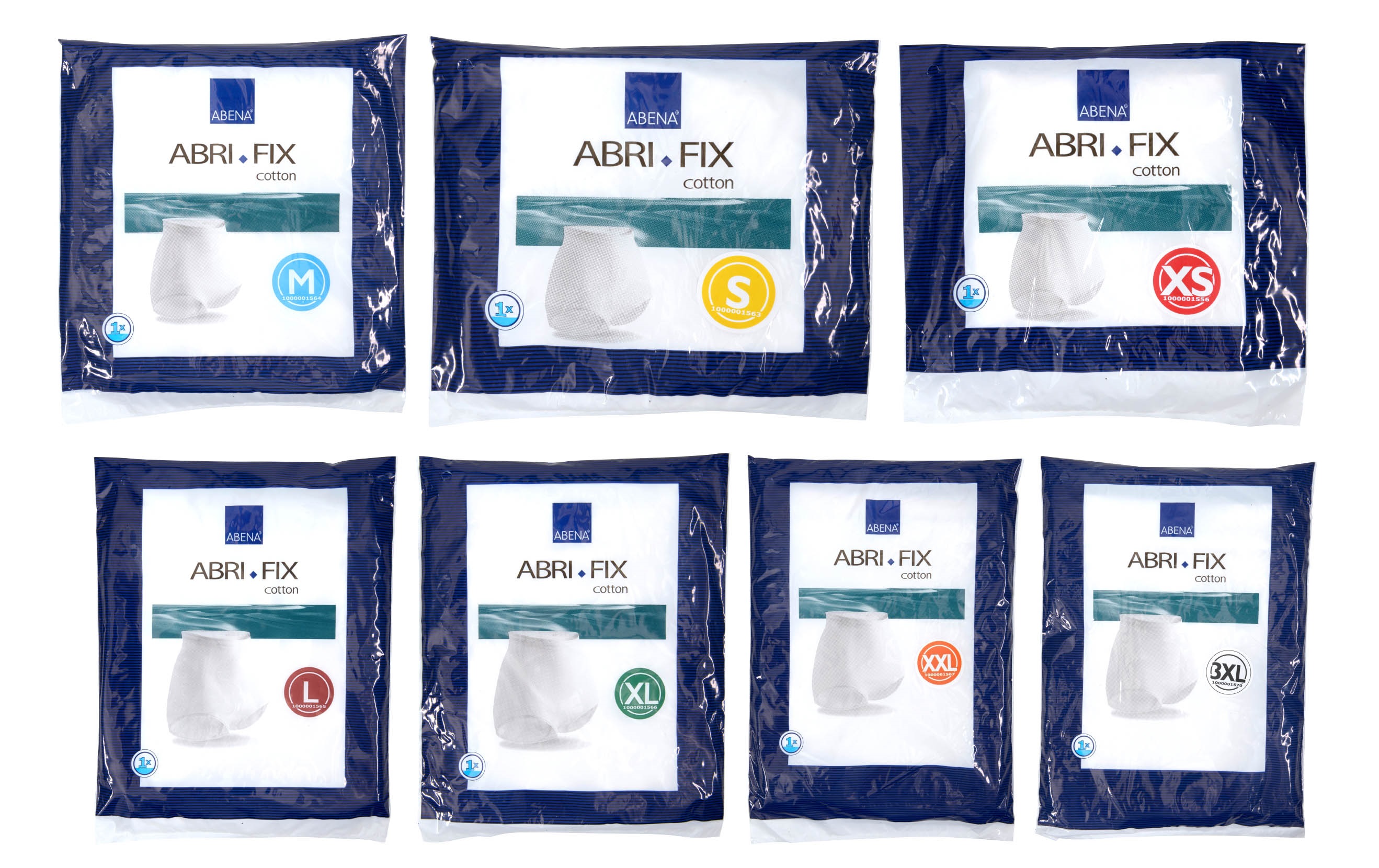 Abri-Fix Cotton är en elastisk andningsbar fixeringsbyxa utan ben, tillverkad i främst bomullsmaterial. Bomullsmaterialet garanterar att fukt transporteras bort från huden, för en torr och behaglig känsla. Byxorna ser ut som vanliga underkläder. Det elastiska materialet och sticktekniken håller skyddet tätt mot kroppen vilket garanterar läckagesäkerhet. Det gör att de fungerar optimalt oavsett aktivitetsnivå och rörelseförmåga. Den sömlösa sticktekniken – ett innovativt sätt att producera textilier som är nästan fria från sömmar – förhindrar tryckmärken och hudirritation. Produkterna kan tvättas 100 gånger och är därför mycket kostnadseffektiva genom längre användningstid. Abri-Fix Cotton har färgkodad midjeresår för respektive storlek, och är även märkta med produktnamn, tvättråd och materialsammansättning. 75 % bomull, 18 % polyamid, 7 % elastan.