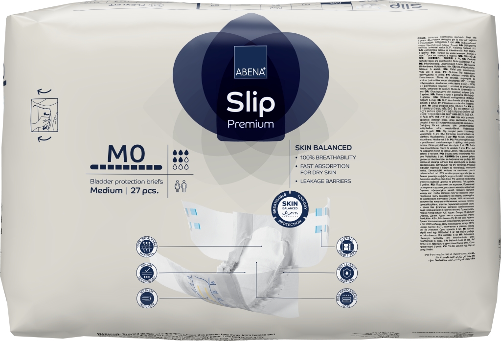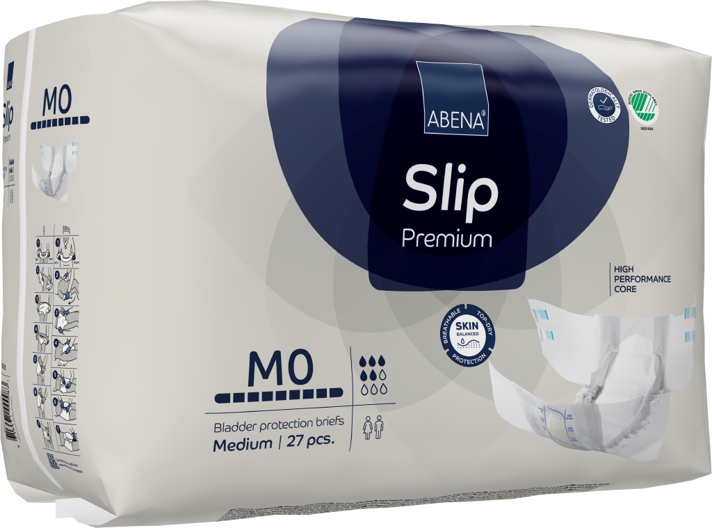 ABENA Slip är vårt förstklassiga sortiment av helt andningsbara och anatomiskt formade allt-i-ett-skydd med tejp mot läckage i samband med måttlig till kraftig inkontinens. Den högeffektiva kärnan med Top-Dry-teknik skapar snabb absorption och en torr yta även efter flera läckage. En kombination av olika barriärer (synliga och osynliga) och resårer (böjda benresår) ger 360-graders läckageskydd runt hela produkten. Tillsammans hjälper dessa funktioner till att skydda huden och bibehålla naturlig pH-balans i huden. Odörsystemet minskar risken för oönskad lukt. Den elastiska kombitejpen håller hög kvalitet med dubbel tejpfunktion och gör det enkelt att justera skyddet tills det sitter säkert och bekvämt. Med hjälp av våtindikatorn och rutsystemet kan användare och vårdgivare hitta den produkt som har rätt absorptionsnivå, vilket också underlättar vid byten. Produkterna är dermatologiskt testade och bär det nordiska Svanenmärket.