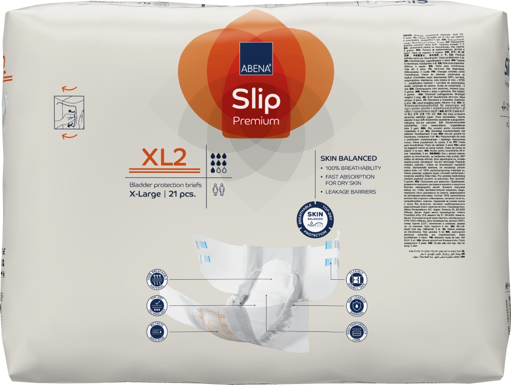 ABENA Slip är vårt förstklassiga sortiment av helt andningsbara och anatomiskt formade allt-i-ett-skydd med tejp mot läckage i samband med måttlig till kraftig inkontinens. Den högeffektiva kärnan med Top-Dry-teknik skapar snabb absorption och en torr yta även efter flera läckage. En kombination av olika barriärer (synliga och osynliga) och resårer (böjda benresår) ger 360-graders läckageskydd runt hela produkten. Tillsammans hjälper dessa funktioner till att skydda huden och bibehålla naturlig pH-balans i huden. Odörsystemet minskar risken för oönskad lukt. Den elastiska kombitejpen håller hög kvalitet med dubbel tejpfunktion och gör det enkelt att justera skyddet tills det sitter säkert och bekvämt. Med hjälp av våtindikatorn och rutsystemet kan användare och vårdgivare hitta den produkt som har rätt absorptionsnivå, vilket också underlättar vid byten. Produkterna är dermatologiskt testade och bär det nordiska Svanenmärket.