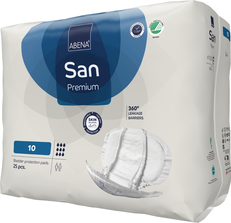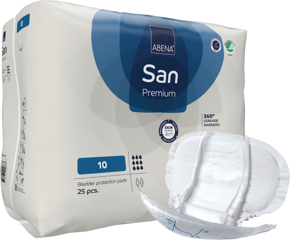 ABENA San 5–11 är vårt förstklassiga sortiment med kroppsformade skydd för måttlig till kraftig inkontinens. Den högeffektiva kärnan med Top-Dry-teknik skyddar och vårdar huden genom att hålla det exponerade området torrt och behagligt även efter flera läckage. Skydden har full andningsförmåga och både stående läckagebarriärer och tvärgående barriärer fram och bak för 360°-graders skydd mot läckage. Tillsammans hjälper dessa funktioner till att skydda huden och bibehålla naturlig pH-balans i huden. Odörsystemet minskar risken för oönskad lukt. Med hjälp av våtindikatorn och rutsystemet kan vårdtagare och vårdgivare hitta den produkt som har rätt absorptionsnivå, vilket även underlättar vid byten. Produkterna är dermatologiskt testade och bär det nordiska Svanenmärket. ABENA San i storlekarna 5–11 bör alltid användas med speciella fixeringsbyxor, till exempel våra Abri-Fix-produkter, för att få åtsittande passform och minska risken för läckage. ABENA:s tvådelade system med fixeringsbyxor och inkontinensskydd är en kostnadseffektiv lösning som använder mindre material, har mindre inverkan på miljön och höjer användarens livskvalitet.
