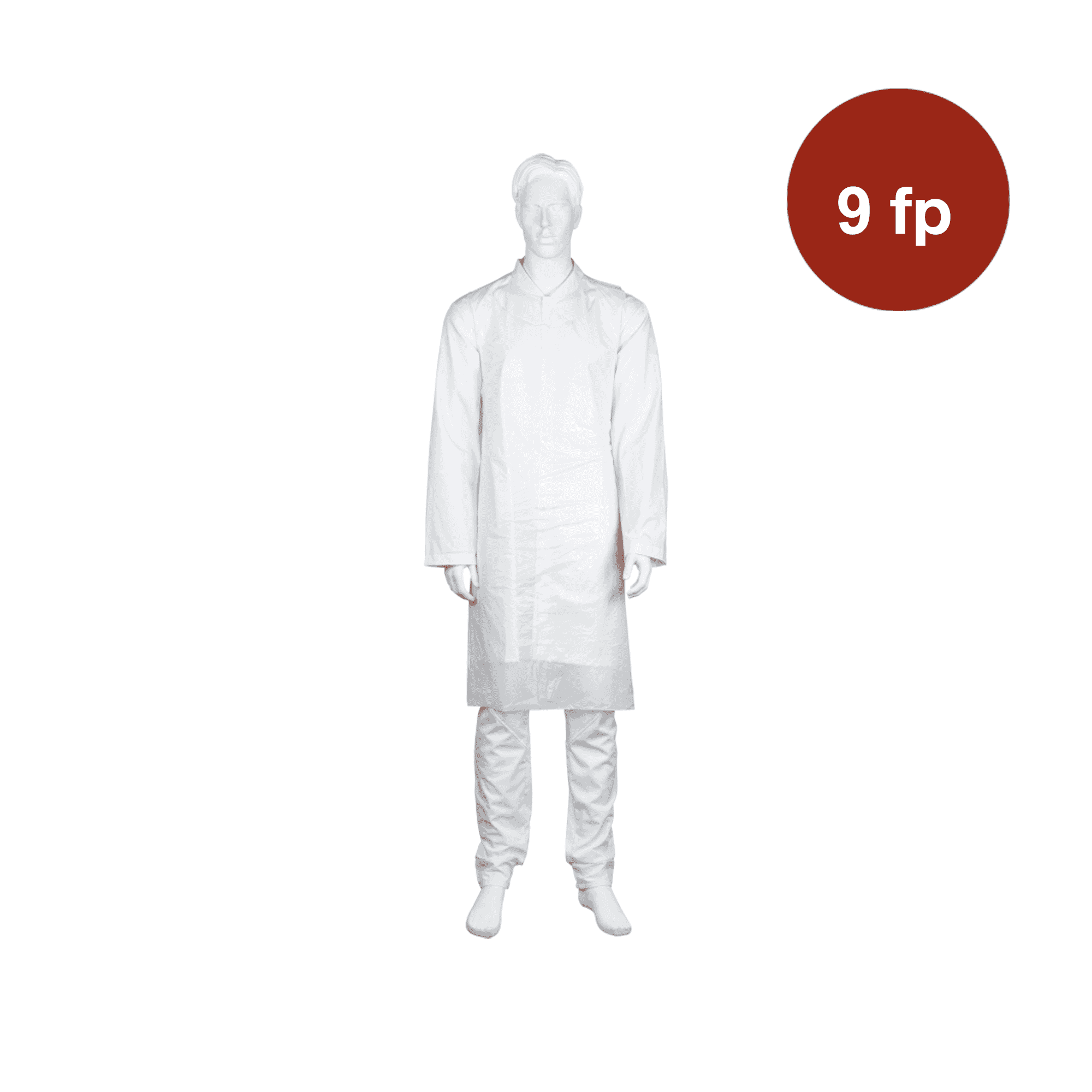 Engångsförkläde av plast, i förpackning. Förpackningen passar i hållare för handskar. Används som skydd för användaren där hög hygienisk standard behövs, t.ex. Inom hälso- och sjukvårdssektorn, vid livsmedelsproduktion, under produktion eller vid förpackning av varor.