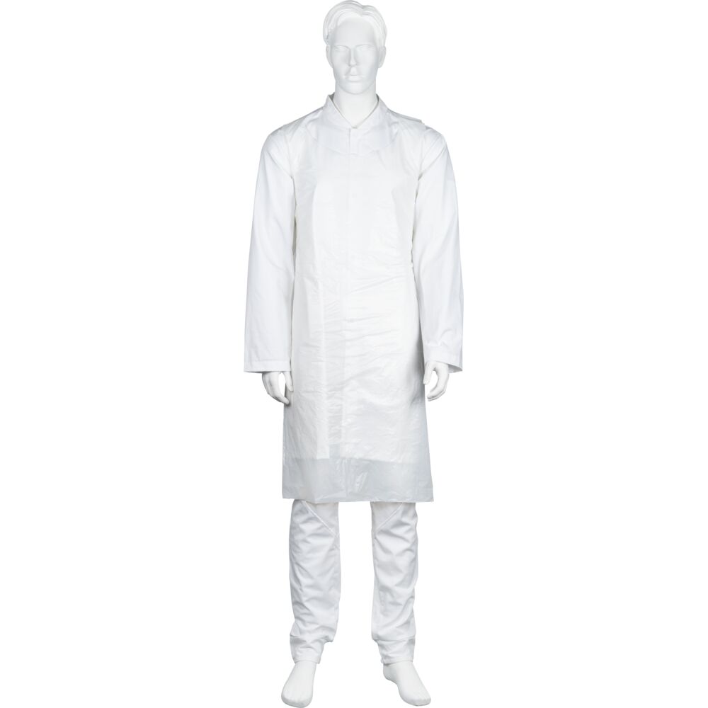 Engångsförkläde av plast med nackband och knytband i ryggen, utvecklat för att ge ett effektivt skydd i miljöer där höga hygienkrav ställs. Förklädet är tillverkat av slitstarkt LDPE-material och erbjuder ett pålitligt skydd mot smuts, vätskor och kontaminering vid dagligt arbete.