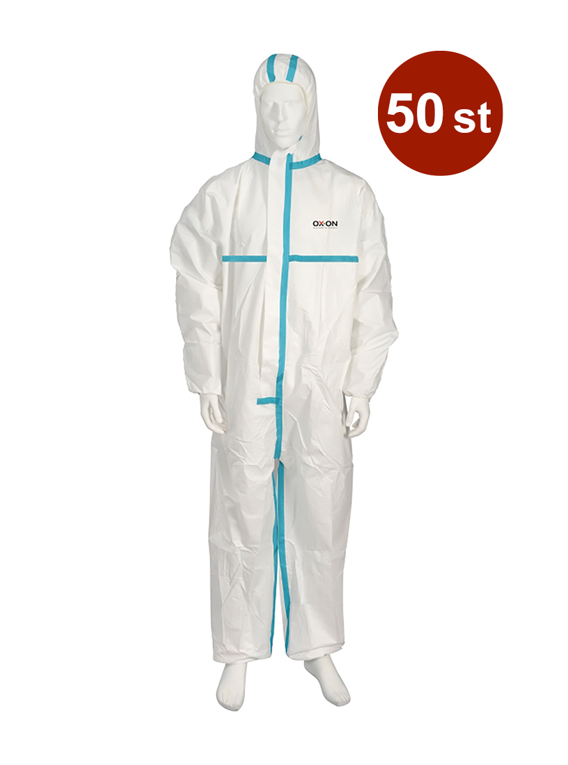 OX-ON Protect Coverall Comfort är en extremt slitstark och vätsketät skyddsdräkt med tejpade sömmar för dig som arbetar med t.ex. asbest, kemikaliehantering, bekämpningsmedel, sprayfärg eller rengöringsmedel. Denna antistatiska overall i ovävt polypropen med mikroporös yta skyddar mot luftburna partiklar som asbest, virus och isolering samt mot flytande kemikalier – även i sömmarna där risken är som störst. Dräkten kombinerar hög skyddsnivå med komfort och rörelsefrihet, tack vare resår i huva, anklar, midja och handleder samt tumremmar som håller ärmarna på plats. Utrustad med dragkedja, stormflik och tejpade sömmar för maximalt skydd.