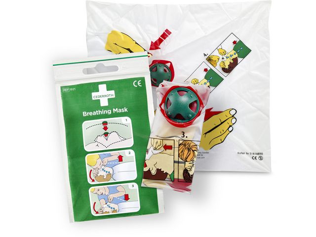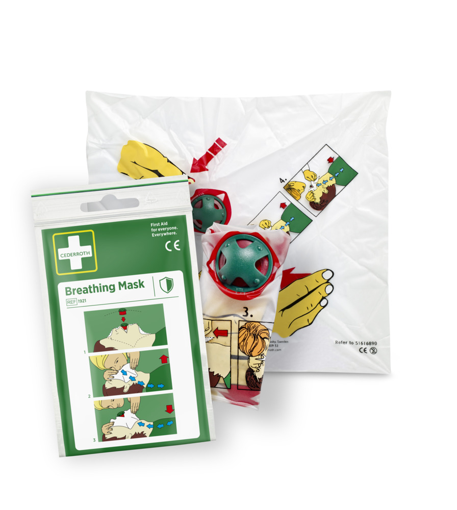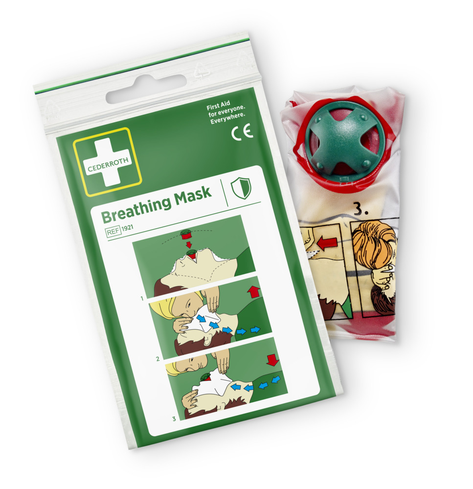 Cederroth Andningsmask är ett hjälpmedel för att ge mun-till-mun-andning på rätt sätt samtidigt som det minskar risken för kontakt mellan hjälpare och skadad. Andningsmasken består av en plastduk med backventil. Tydliga instruktioner är tryckta direkt på duken. På plastduken finns tydliga instruktioner för mun-mot-mun-metoden och hur masken ska placeras över den skadades ansikte. Backventilen signalerar vilken sida som skall placeras upp mot hjälparen (grön) respektive ned i den skadades mun (röd).