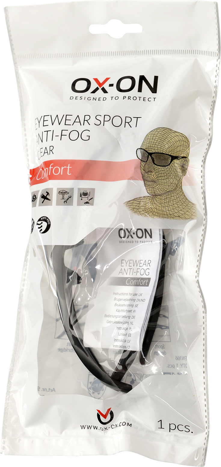 OX-ON Eyewear Sport Anti-fog Comfort Clear med repskydd är lätta glasögon i en smart sportig design. Kraftiga, slitstarka och säkerhetsgodkända skyddsglasögon med imskydd, perfekta för arbete både inom- och utomhus där god sikt är viktigt. Ramen och linserna är tillverkade av polykarbonatmaterial, vilket gör glasen extremt starka och slagtåliga, lämpliga för krävande miljöer. Glasögonen har dessutom mjuk näsbrygga och vadderade skalmar, vilket ger hög komfort och passform under längre användning. Linserna har optisk klass 1-certifiering, vilket gör att glasögonen kan användas permanent och ger 99,9 % UV-skydd.