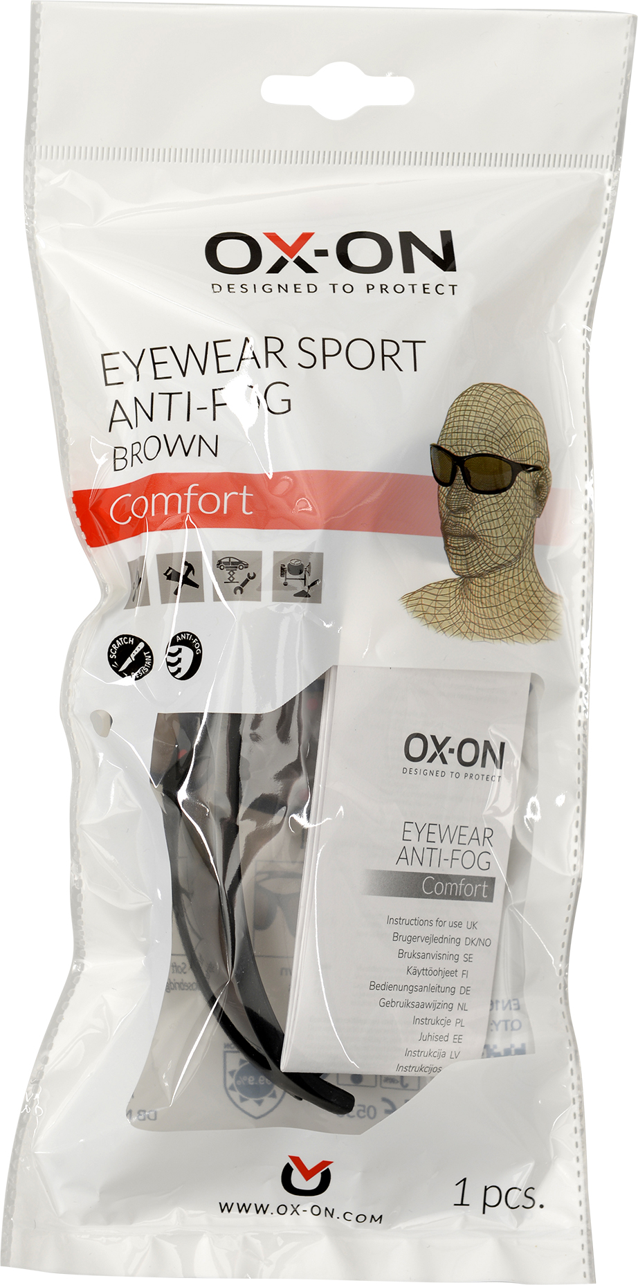 OX-ON Eyewear Sport Anti-fog Comfort – Brown med repskydd är lätta glasögon i en smart sportig design. Kraftiga, slitstarka och säkerhetsgodkända skyddsglasögon med imskydd, perfekta för arbete både inom- och utomhus där god sikt är viktigt. Ramen och linserna är tillverkade av polykarbonatmaterial, vilket gör glasen extremt starka och slagtåliga, lämpliga för krävande miljöer. Glasögonen har dessutom mjuk näsbrygga och vadderade skalmar, vilket ger hög komfort och passform under längre användning. Linserna har optisk klass 1-certifiering, vilket gör att glasögonen kan användas permanent och ger 99,9 % UV-skydd.