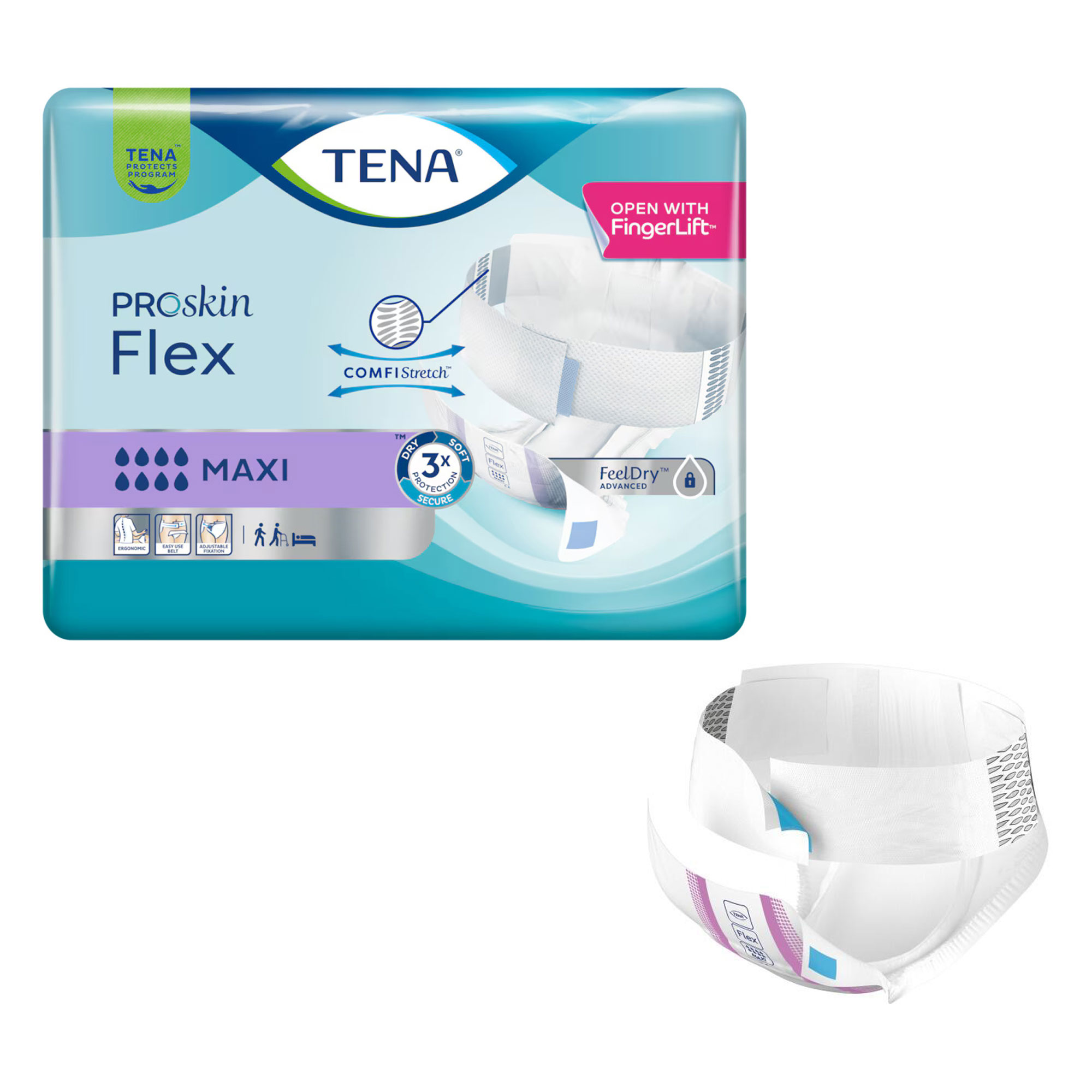 TENA Flex Maxi är en innovativ bältesförsedd inkontinensprodukt som kombinerar hög läckagesäkerhet med användarvänlig design. Produkten är utvecklad för personer med svår inkontinens och erbjuder en ergonomisk lösning som gör byten enklare för både användare och vårdpersonal. Det mjuka och elastiska COMFIStretch™-bältet ger en flexibel passform som anpassar sig till olika kroppsformer och ger ett säkert, bekvämt skydd. Tack vare FeelDry Advanced™-teknologin transporteras urin snabbt bort från ytan, vilket håller huden torr och bidrar till god hudhälsa. TENA Flex Maxi kan enkelt fixeras både framifrån och bakifrån, i stående eller liggande position, med återförslutningsbara kardborrefästen för justerbar passform och säker fixering.