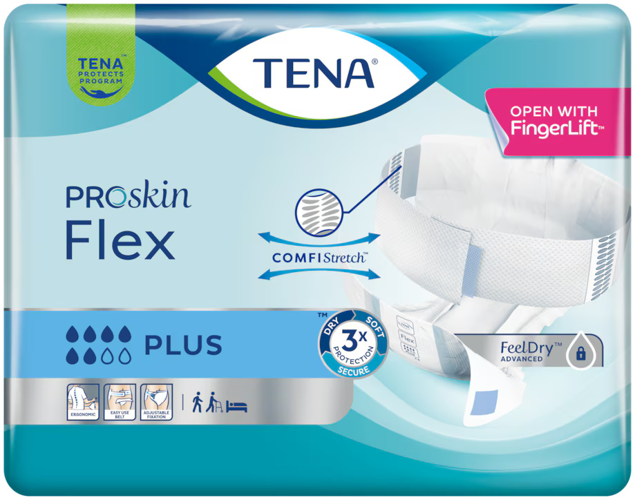 TENA Flex Plus är en revolutionerande bältesförsedd inkontinensprodukt designad med både användare och vårdpersonal i åtanke. Produkten erbjuder hög läckagesäkerhet och gör byten mer ergonomiska och smidiga. Det superabsorberande skyddet är perfekt för personer med svår inkontinens och hålls på plats med ett enkelt fästsystem. Det mjuka och elastiska COMFIStretch™-bältet anpassar sig efter olika kroppsformer, sitter säkert och bekvämt och ger ett utmärkt läckageskydd.