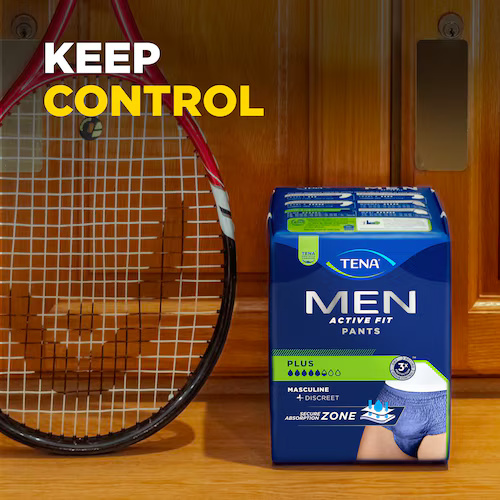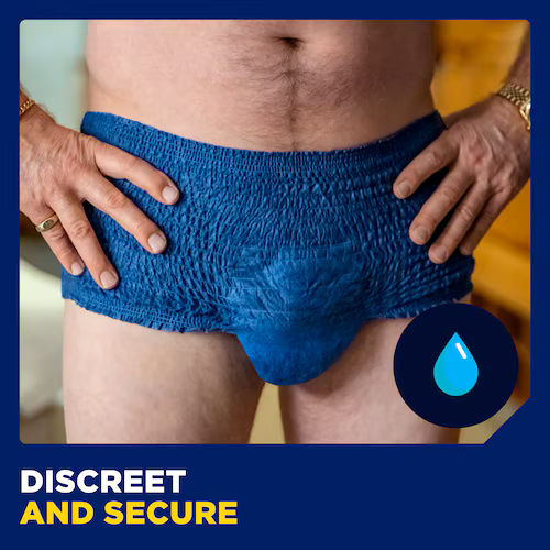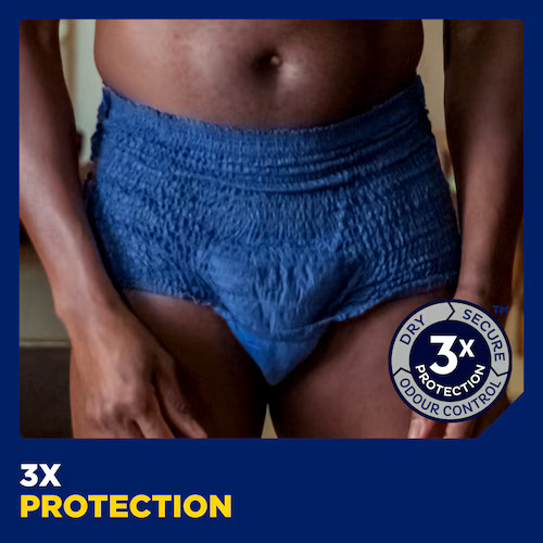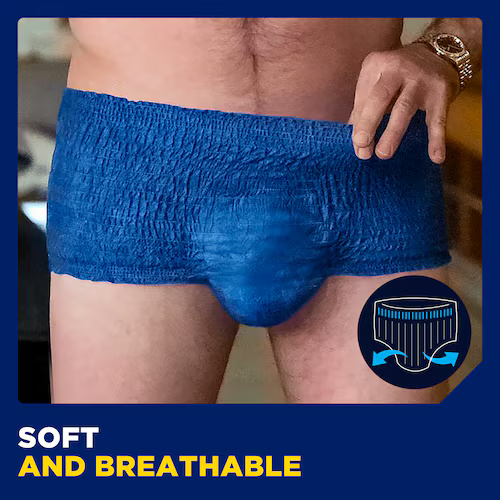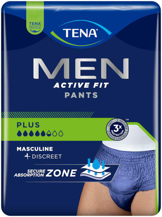 Bibehåll din aktiva livsstil trots stora urinläckage med TENA Men Pants Plus – absorberande engångsunderkläder utformade efter den manliga anatomin. De mörkblå underkläderna kombinerar diskretion, komfort och säkerhet. Med resårmidja och andningsbar bomullskänsla sitter de bekvämt och ser ut som vanliga kalsonger. Tack vare den säkra absorptionszonen som effektivt kapslar in vätskan får du trippelt skydd mot läckage, lukt och fukt. Med TENA Men kan du känna dig trygg, både på jobbet, på gymmet och i sociala sammanhang.