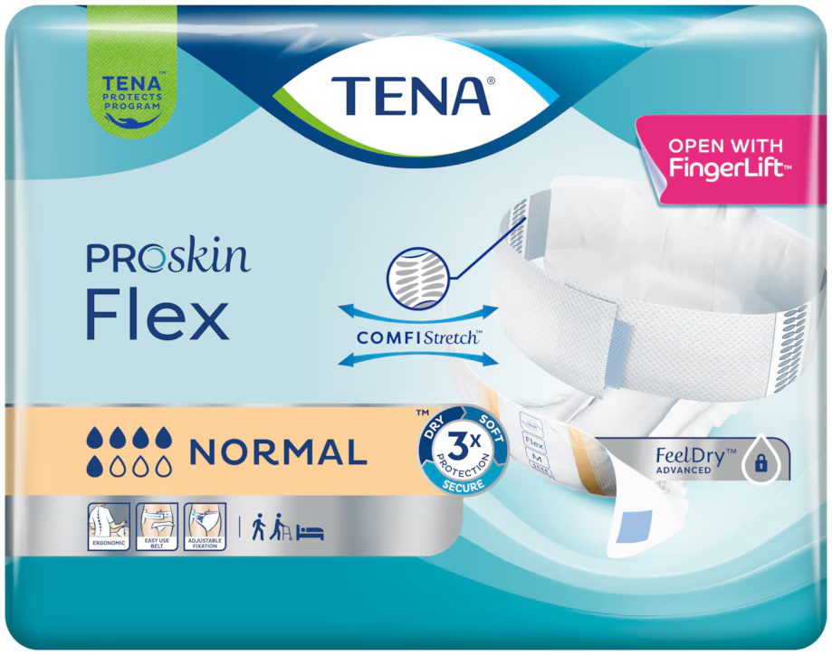 TENA Flex Normal är en revolutionerande bältesförsedd inkontinensprodukt designad med både användare och vårdpersonal i åtanke. Produkten erbjuder god läckagesäkerhet och gör byten mer ergonomiska och smidiga. Det superabsorberande skyddet är perfekt för personer med svår inkontinens och hålls på plats med ett enkelt fästsystem. Det mjuka och elastiska COMFIStretch™-bältet anpassar sig efter olika kroppsformer, sitter säkert och bekvämt och ger ett enastående läckageskydd.