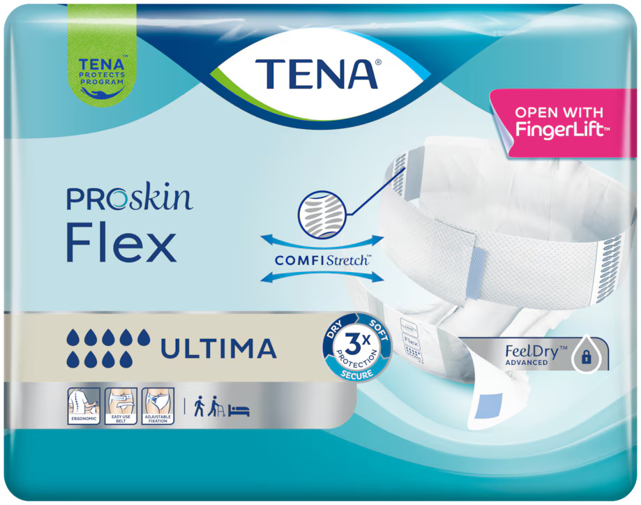 TENA Flex Ultima är en avancerad bältesförsedd inkontinensprodukt utformad med fokus på både användare och vårdpersonal. Produkten erbjuder hög läckagesäkerhet och möjliggör ergonomiska byten. Dessa superabsorberande skydd passar perfekt för personer med svår inkontinens eller vid nattanvändning. Det mjuka och elastiska COMFIStretch™-bältet anpassas enkelt efter olika kroppsformer, sitter säkert och bekvämt samt ger ett utmärkt läckageskydd. De greppvänliga fästena kan justeras framtill för en säker passform och pålitligt skydd mot läckage. FingerLift™-fliken gör det lätt att hitta bältesöppningen och snabbt förbereda produkten för användning, vilket förbättrar ergonomin vid applicering.