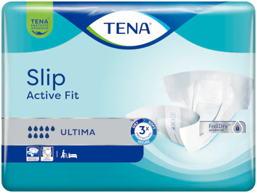 TENA Slip Active Fit Ultima är ett allt-i-ett-inkontinensskydd med plastad baksida och justerbara flikar, särskilt utformat för en aktiv vardag. Skyddet har en snabbverkande kärna med FeelDry™-teknologi som effektivt absorberar urinet och ger ett säkert skydd mot läckage, även vid större mängder vätska. De starka, självhäftande EasyFix-flikarna kan enkelt justeras för en bekväm och säker passform och gör det möjligt att byta skyddet både i stående och liggande läge. Odour Neutralizer motverkar oönskad lukt och våtindikatorn visar tydligt när det är dags att byta. Produkten är dermatologiskt testad och utformad för att vara skonsam mot huden under långvarig användning.