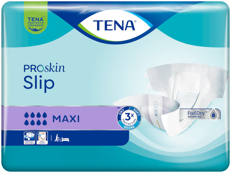 TENA Slip Maxi är ett öppet allt-i-ett-inkontinensskydd med justerbara flikar för perfekt passform, komfort och läckageskydd. Till skillnad från många andra vuxenblöjor har TENA ProSkin Slip ett mjukt textilliknande material med kroppsnära passform och hög läckagesäkerhet vilket gör att det passar utmärkt vid nedsatt rörlighet eller vid byte i sängen. Tack vare FeelDry Advanced™-teknologin transporteras vätska snabbt bort från ytskiktet för att hålla huden torr. Den snabbt absorberande kärnan kapslar in även stora mängder urin (absorptionskapacitet 1066 ml) för en torrare känsla, och det andningsbara materialet ConfioAir™ låter huden andas. Alla dessa egenskaper bidrar till en naturligt god hudhälsa. Den öppna designen med starka fixerande flikar gör det lätt att byta stående eller liggande, och möjliggör enkel återförslutning för en säker passform. Odour Neutralizer ger en känsla av fräschhet, medan våtindikatorn visar när det är dags för byte.