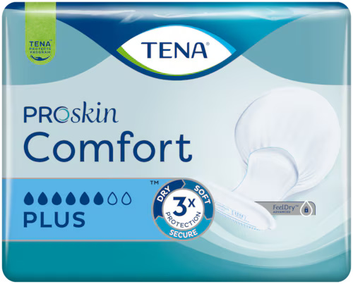 TENA Comfort Plus är ett bekvämt skålformat inkontinensskydd med hög absorptionsförmåga och kroppsnära passform. FeelDry Advanced™ transporterar snabbt bort urin från ytskiktet för att hålla huden torr, medan den högabsorberande kärnan kapslar in större mängder urin. Den andningsbara ConfioAir-baksidan bidrar till hudhälsa och komfort. Produkten används med TENA Fix fixeringsbyxor och kan tas på stående eller liggande.