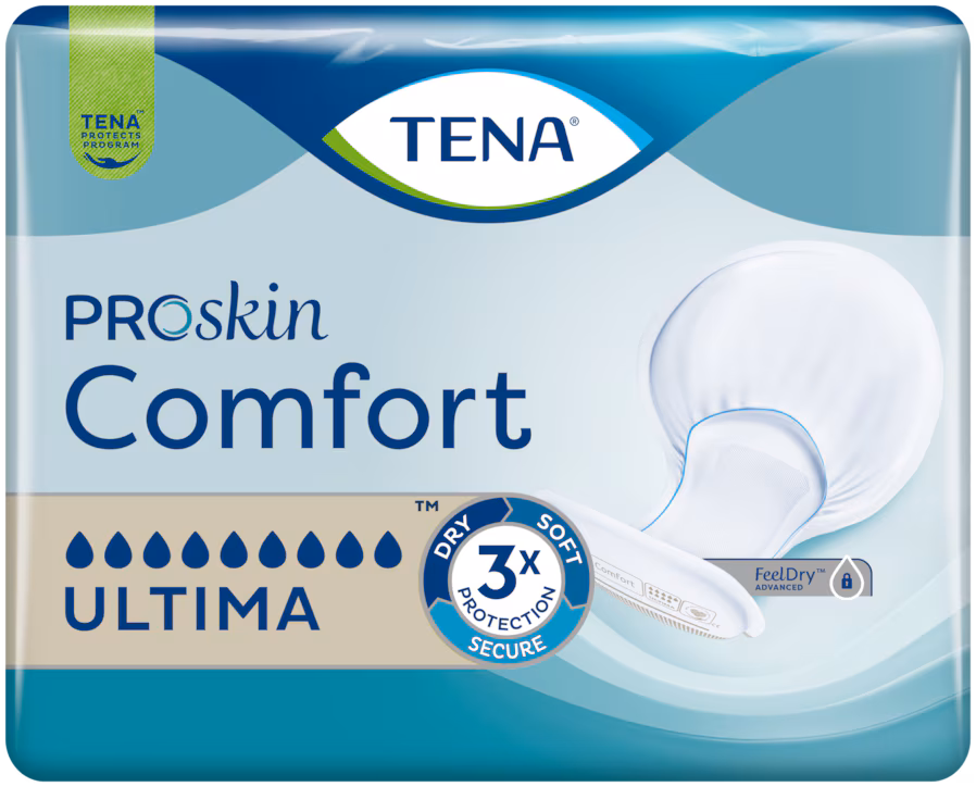 TENA Comfort Ultima är ett bekvämt, extra långt och skålformat inkontinensskydd för dig som behöver en mycket absorberande produkt men vill fortsätta använda bindor. Den höga absorptionsförmågan ger ett pålitligt skydd vid plötslig total tömning av blåsan och under natten. Den unika skålformen säkerställer en kroppsnära passform som effektivt förhindrar läckage. Systemet FeelDry Advanced™ transporterar snabbt bort vätska från ytan så att huden hålls torr, medan den andningsbara ConfioAir-baksidan låter huden andas och bidrar till bibehållen hudhälsa. Skyddet hålls på plats med hjälp av TENA Fix fixeringsbyxor och kan tas på både stående och liggande position.