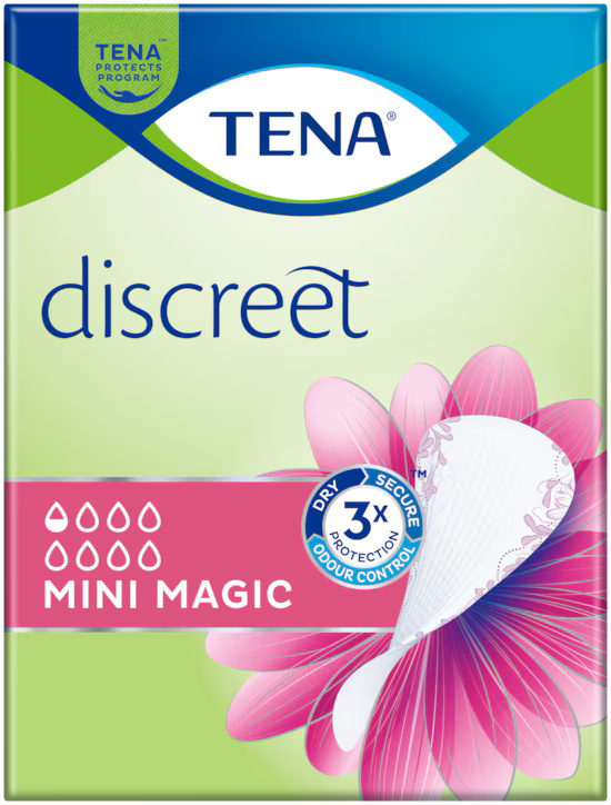 TENA Discreet Mini Magic är det minsta trosskyddet i serien, men erbjuder ändå ett överraskande säkert skydd vid små urinläckage och tillfälliga droppar. Skyddet är lika litet som ett vanligt trosskydd men mycket mer absorberande tack vare microPROTEX™-teknologi som snabbt kapslar in vätskan på ett nästan magiskt sätt. Det är så tunt och diskret att du knappt märker att du bär det, vilket gör det perfekt för daglig användning. Låt aldrig små urinläckage påverka ditt självförtroende – TENA Discreet Mini Magic ger dig trygghet och komfort varje dag.