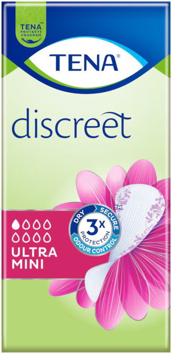 TENA Discreet Ultra Mini är ett extra tunt men superabsorberande trosskydd som erbjuder diskret och pålitligt skydd vid mycket små urinläckage och tillfälliga droppar. Trots sin minimala tjocklek ger det enastående absorptionsförmåga tack vare den avancerade microPROTEX™-teknologin, som snabbt kapslar in vätska och håller ytan torr. Skyddet har samma storlek som ett vanligt trosskydd men är speciellt utvecklat för urinläckage, vilket gör det perfekt för dig som vill känna dig fräsch, trygg och bekväm hela dagen. Den tunna, flexibla designen följer kroppens rörelser och är nästan osynlig under kläderna.