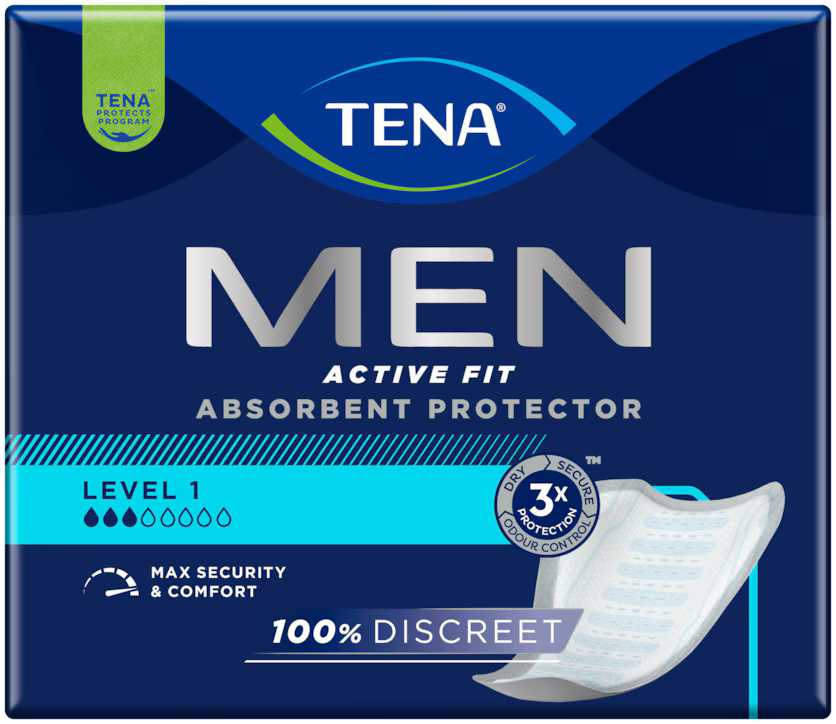 TENA Men Level 1 är ett diskret och bekvämt inkontinensskydd som är särskilt utformat för män vid mycket små urinläckage. Den tunna designen på endast 3,5 mm gör skyddet nästan omärkbart, samtidigt som den ger pålitligt skydd mot läckage, lukt och fukt. Den säkra absorptionszonen kapslar effektivt in vätskan och håller ytan torr, vilket ger en fräsch och trygg känsla under hela dagen.