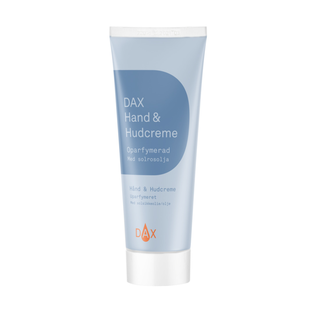DAX Hand- & Hudkräm är en mild och effektiv hudvårdslösning för daglig användning på händer och hela kroppen. Krämen gör torr och narig hud naturligt mjuk och smidig och absorberas snabbt utan att lämna kladdiga rester. Produkten innehåller solrosolja som vårdar och återfuktar huden, samtidigt som den är fri från färgämnen.