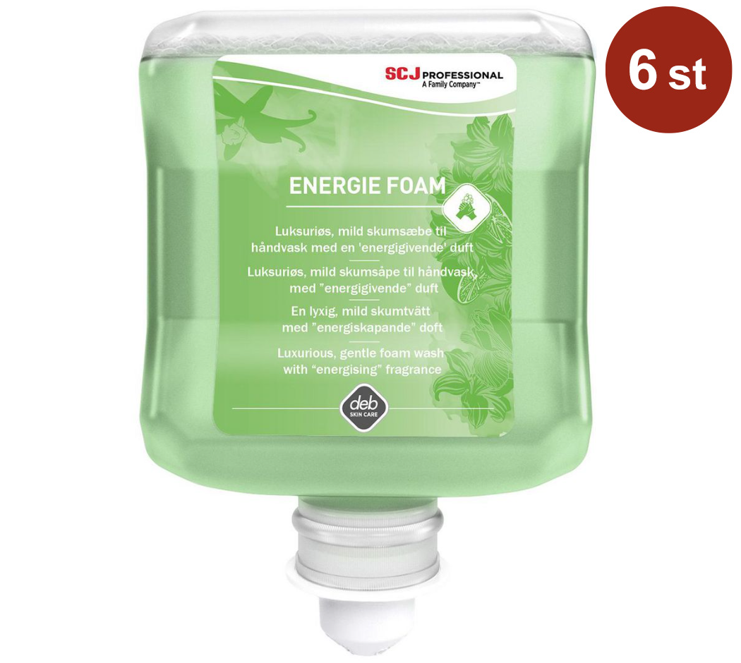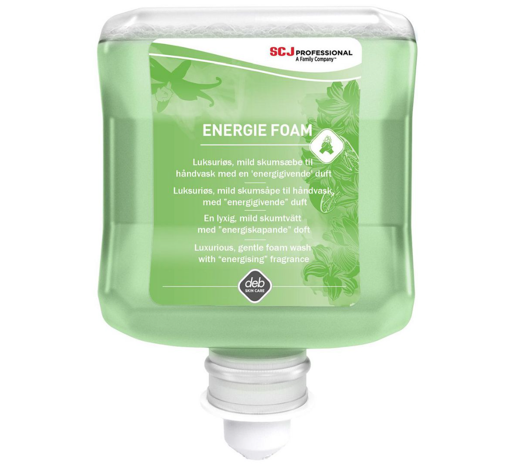 Deb Energie Foam är en lyxig och parfymerad skumtvål med en energiskapande doft av citrus och kryddor. Formulan innehåller eteriska oljor och hudvårdande ämnen som återfuktar huden och förebygger uttorkning. Skummet är silkesmjukt och fylligt, vilket ger en skonsam och effektiv handtvätt. Produkten rengör händerna och avlägsnar över 99 % av smuts och bakterier. Dispenseras direkt som skum, vilket minskar tiden för applicering. Dermatologiskt testad och säker för frekvent användning.