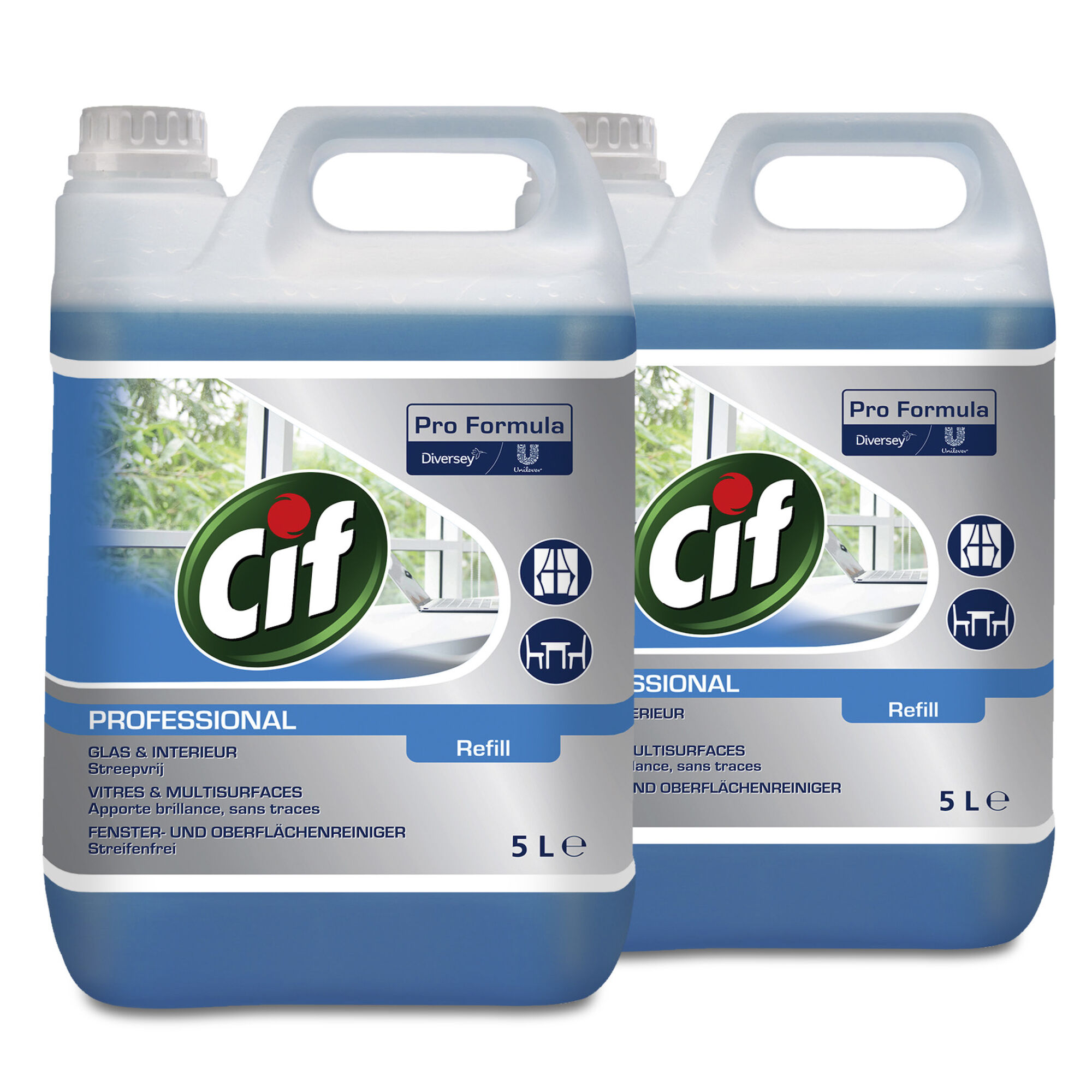 Cif Professional Glas & Universal tar snabbt bort smuts samt fettfläckar och efterlämnar en skinande blank yta på några sekunder. Produkten används outspädd på glas och interiör som till exempel speglar, bord och andra vattentåliga ytor.