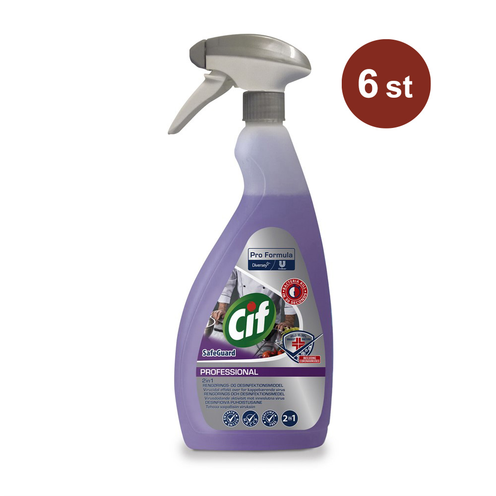Cif Pro Formula SafeGuard 2in1 Cleaner Disinfectant är ett effektivt rengörings-och desinfektionsmedel i ett steg som passar alla hårda ytor, inklusive livsmedelsytor. Den är mycket effektiv mot ett brett spektrum av mikroorganismer i alla vattenförhållanden och är tuff mot fett och intorkade matrester.