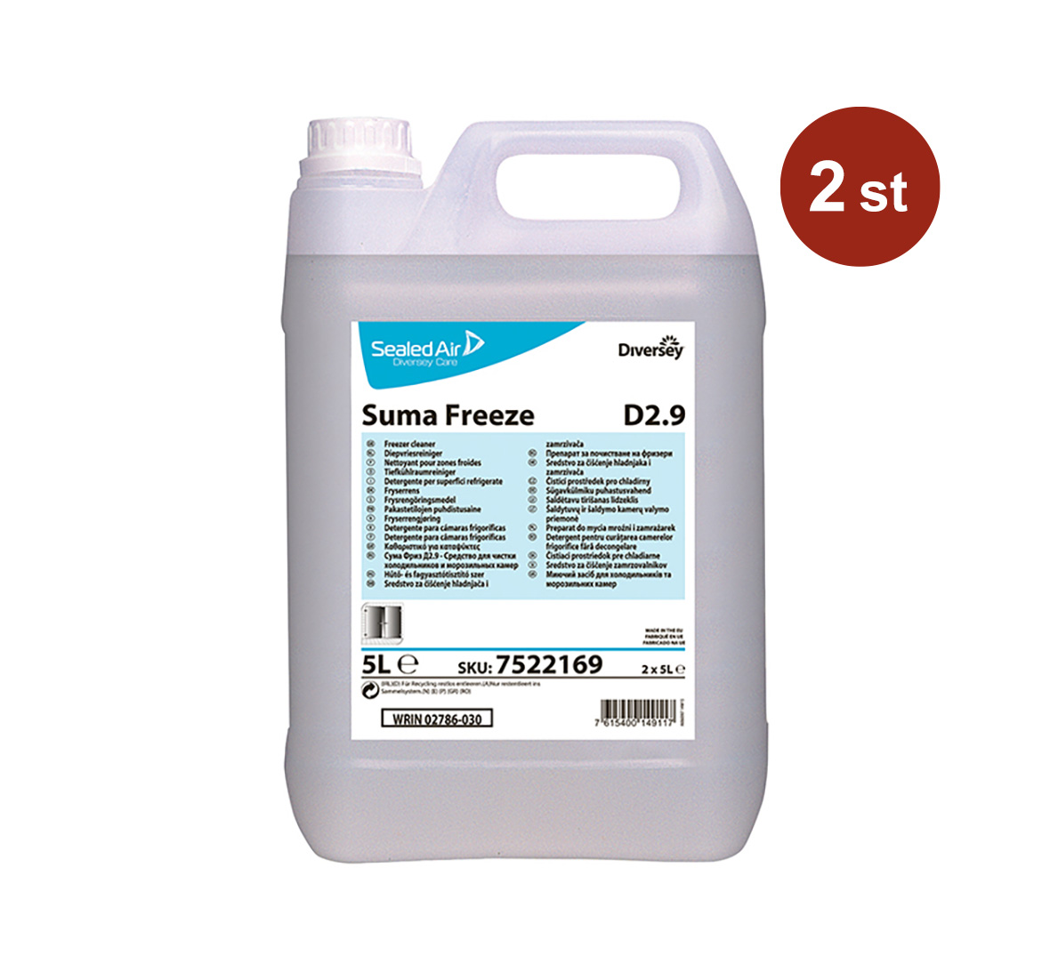 Suma Freeze D2.9 är ett bruksfärdigt rengöringsmedel för manuell eller automatisk rengöring av alla ytor i frysrum, även golv, dörrar samt väggar, vid temperaturer ner till -25°C. Lämplig för storkök samt livsmedelsindustrin.