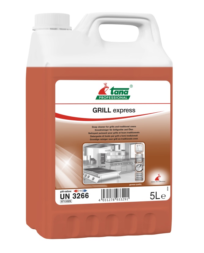 Ugns- och grillrengöringsmedlet Grill express från Tana Professional avlägsnar lätt och effektivt feta livsmedel och de envisaste fett- och smutsavlagringarna. Rengöringsmedlet för ugn och grill ger optimalt resultat och fungerar även på fastbränt fett. Med god vidhäftningsförmåga på lodräta ytor säkerställs att produkten stannar kvar där den appliceras. Behållarens spraymunstycke har dessutom en arbetsmiljövänlig skumfunktion som minskar spridningen av hälsofarliga aerosoler.