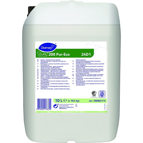 Clax 200 Pur-Eco är en effektiv tvättförstärkare uppbyggd av en kombination av enzymer och nonjontensider. Blandningen av olika enzymer är effektiva mot olika typer av fläckar med specifika enzymer för minskat slitage, ökad vithet och bevarande av färger. Produkten ger särskilt bra resultat på tvättgods nersmutsat av fett och olja. Efter att smutsen avlägsnats har Clax 200 Pur-Eco en mycket god olje- och fettemulgerande verkan som förhindrar återsmutsning. Clax 200 Pur-Eco används huvudsakligen i kombination med en alkalisk tvättförstärkare eller det vanliga tvättmedlet. I kombination med dessa är Clax 200 Pur-Eco främsta uppgift att öka emulgeringsverkan av smutsen från fett och olja. Detta medför ett avsevärt förbättrat tvättresultat på kraftigt nersmutsat tvättgods av bl.a bomull, polyester/bomull, arbetskläder och bordslinne. Clax 200 Pur-Eco kan även användas vid mattvätt. Produkten innehåller inte optiska vitmedel och är därför utmärkt för kulörta textilier. Nonjontensiderna har valts med största omsorg för miljön.