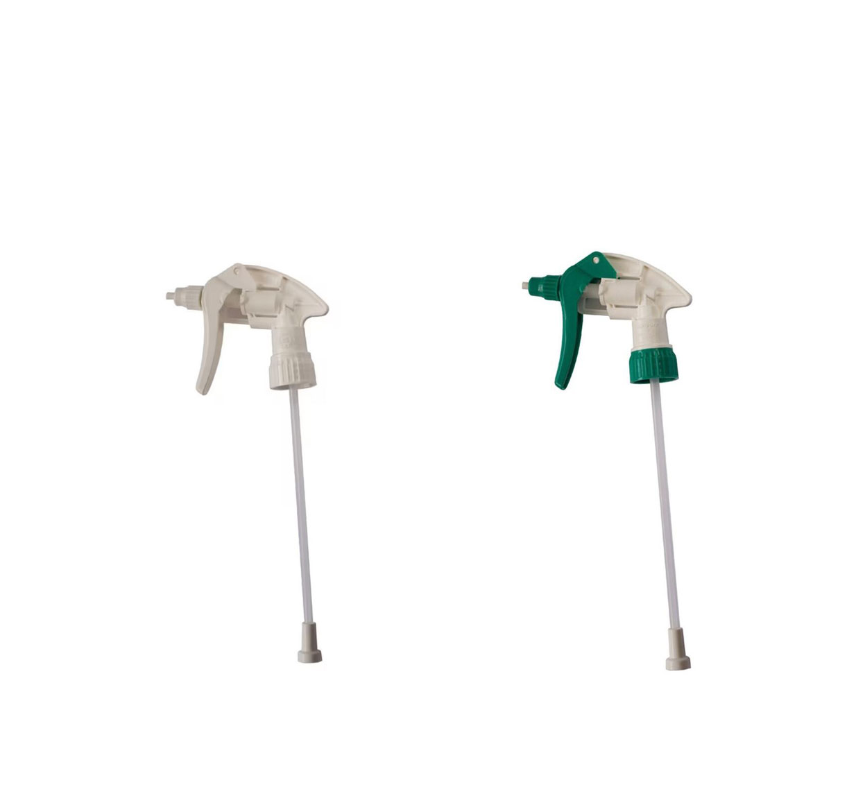 Spraymunstycke skum till Room Care RTU flaskor. Grön och vit är skummunstycke. Blå, brun och röd är spraymunstycke