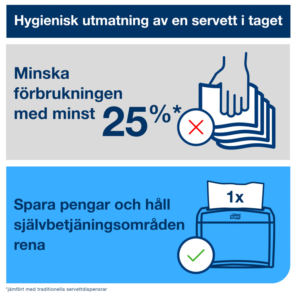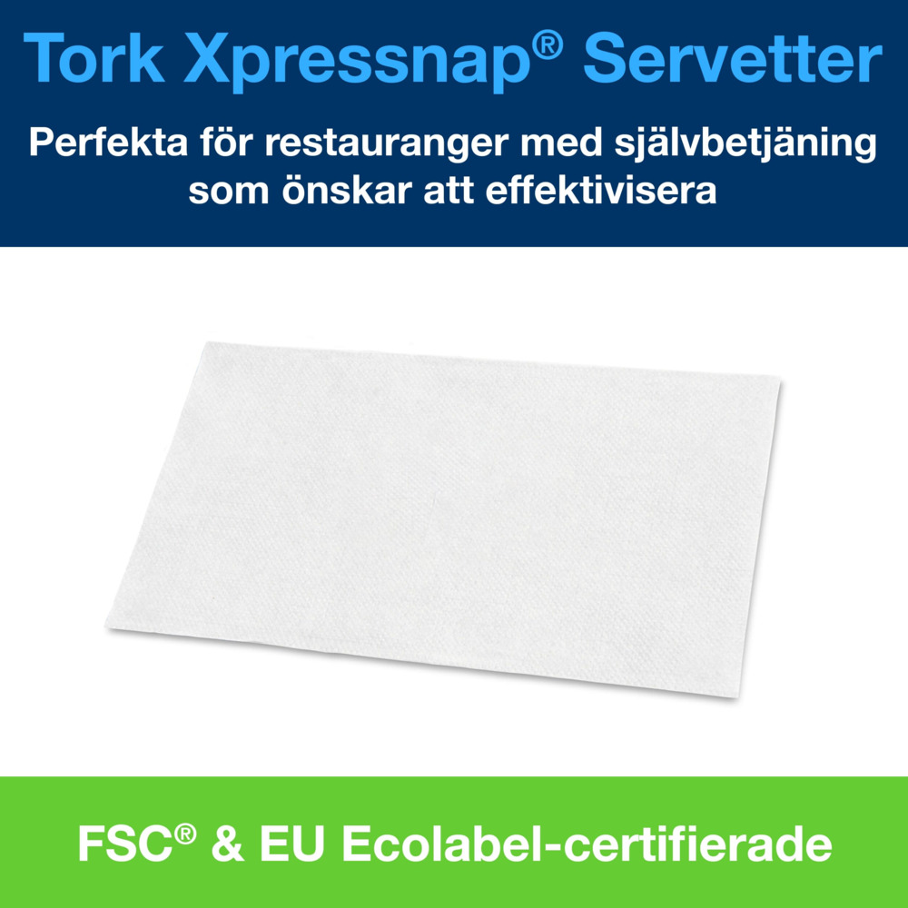 I hektiska självservicemiljöer behövs en balans mellan bekvämlighet och kvalitet – Tork Xpressnap® Extra Mjuk Dispenserservett i 2-lagers konstruktion erbjuder båda delarna. Servetterna passar alla Tork Xpressnap® Dispensrar vilket gör beställning och lagerhantering enklare. Tack vare arkvis utmatning minskar förbrukningen med upp till 25 % jämfört med traditionella dispensrar, vilket även förbättrar hygienen då gästerna endast rör vid servetten de använder.