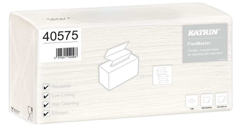Katrin FlexMaster är en mångsidig och flexibel lösning för olika rengöringsbehov. Den är återanvändbar, har hög absorptionsförmåga och lämnar minimalt med fibersläpp. Förpackningen är förseglad och självdoserande vilket gör att dukarna enkelt matas ut, ark för ark.