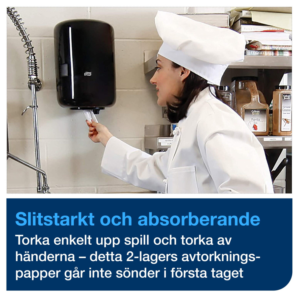 Tork Plus Centrummatad M2 2-Lags Blå är ett tåligt och absorberande avtorkningspapper för spill och handavtorkning i kök, industrilokaler och andra miljöer med högt tempo. Papperet är centrummatad för enkel enhandsutmatning med hög kapacitet och obegränsad utmatning, vilket underlättar för personalen. Tork slutindikator hjälper till att planera byten av rullar och minskar avbrott i arbetet. Produktionen sker med minskat fossilt CO2-utsläpp genom användning av biogas och certifierad förnybar el.