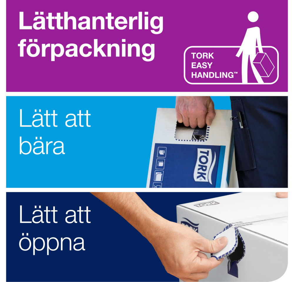 ● Tork Easy Handling™ – förpackningar som är enkla att bära, öppna och platta ihop