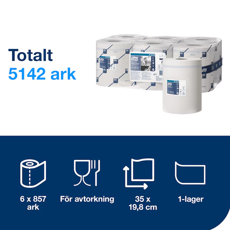 Tork Reflex® Avtorkningspapper är ett 1-lagerspapper vars styrka och höga absorptionsförmåga gör att det passar perfekt för både avtorkning och för att torka händerna. Detta papper kan användas i Tork Reflex® Centrummatad dispenser som matar ut ett ark i taget och passar ditt teams arbetsflöde, minskar åtgången och minimerar risken för smittspridning.