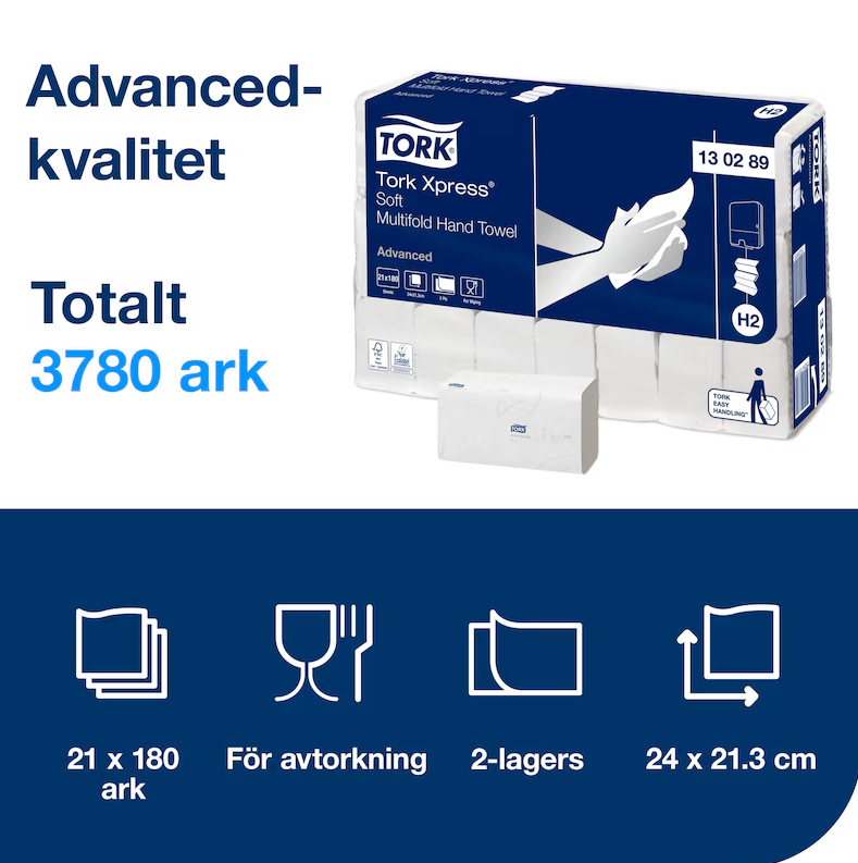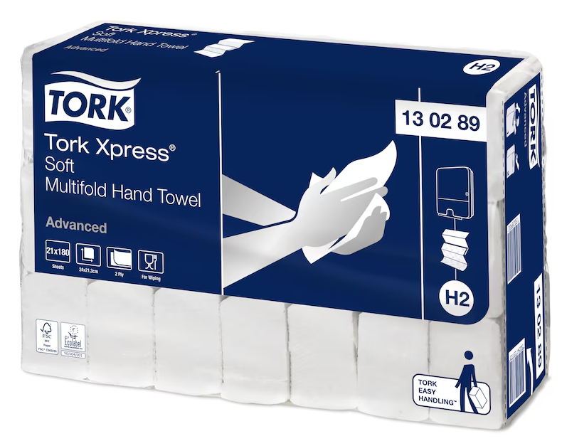 Med behagliga Tork Xpress® Mjuk Multifold Handduk i Advanced design får dina besökare en bekväm och utmärkt handavtorkning. Handdukarna är skonsamma mot huden och förmedlar en känsla av hög kvalitet. De passar i Tork Xpress® Dispenser Multifold Handduk för toalettutrymmen med medelhög besöksfrekvens. Dispensern får plats i små utrymmen och erbjuder dina gäster både komfort och hygien.