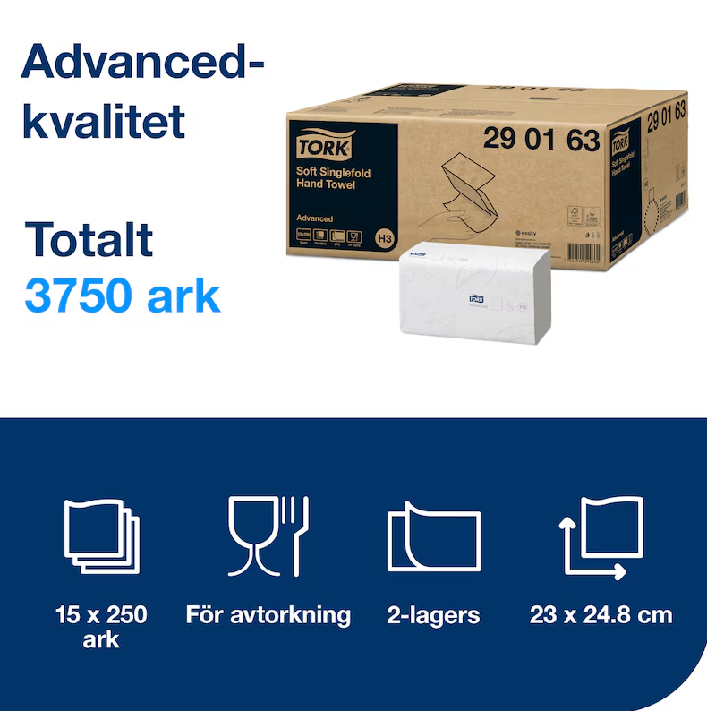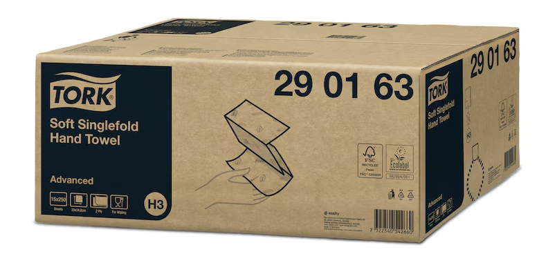 Tillgodose handavtorkningsbehoven med Tork Singlefold Handduk i Advanced-kvalitet som har rätt kvalitet för miljöer där kostnad och prestanda är lika viktiga faktorer. Denna handduk passar Tork Dispenser Singlefold Handduk för krävande miljöer. Med sin tillförlitliga utmatning av ett ark i taget främjar den god hygien och hjälper till att kontrollera handdukskonsumtionen.