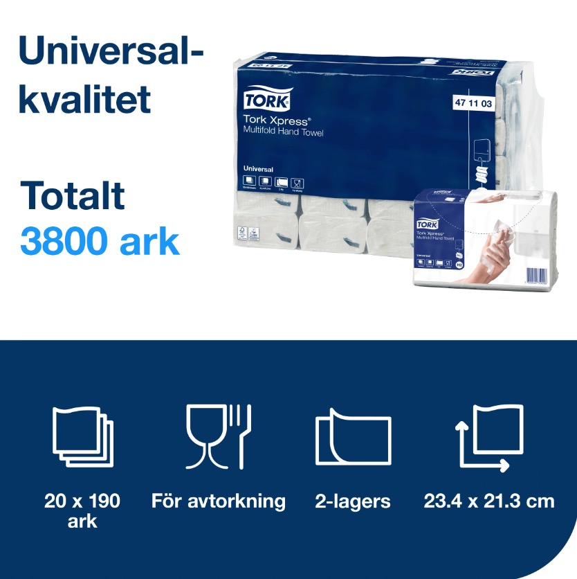 Bli kostnadseffektiv och minska avfallet i toalettutrymmen med våra Tork Xpress® Multifold Handdukar. De är tillverkade i en mindre, prisvärd storlek och Universal-kvalitet, vilket gör dem effektiva vid handtorkning, och de är även lämpliga för kortvarig kontakt med livsmedel. Använd dem med Tork Xpress® dispenser för handdukar som matar ut en handduk i taget för att förbättra hygienen och minska avfallet. Handdukarna kan dessutom tas direkt ur förpackningen för extra bekvämlighet.