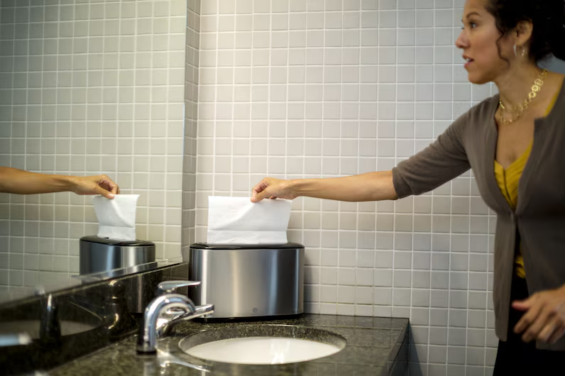 Nedspolningsbar handduk för toalettutrymmen med hög risk att handdukarna hamnar i toaletten istället för i papperskorgen.