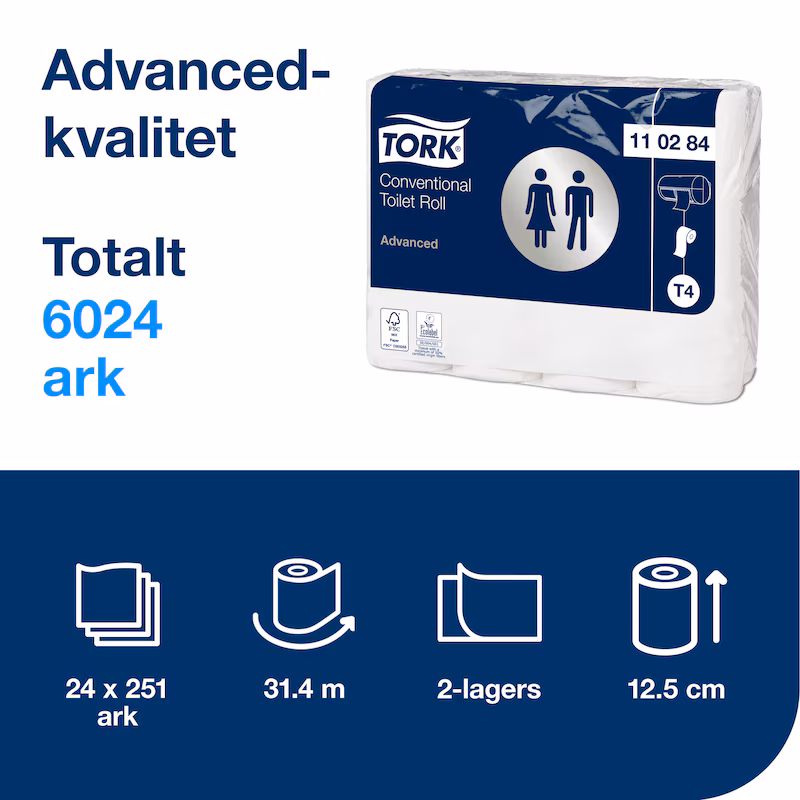Ge gästerna samma komfort som hemma med extra långt toalettpapper i Advanced-kvalitet från Tork. Det här är ett kostnadseffektivt och funktionellt toalettpapper – perfekt för toalettutrymmen med låg besöksfrekvens.