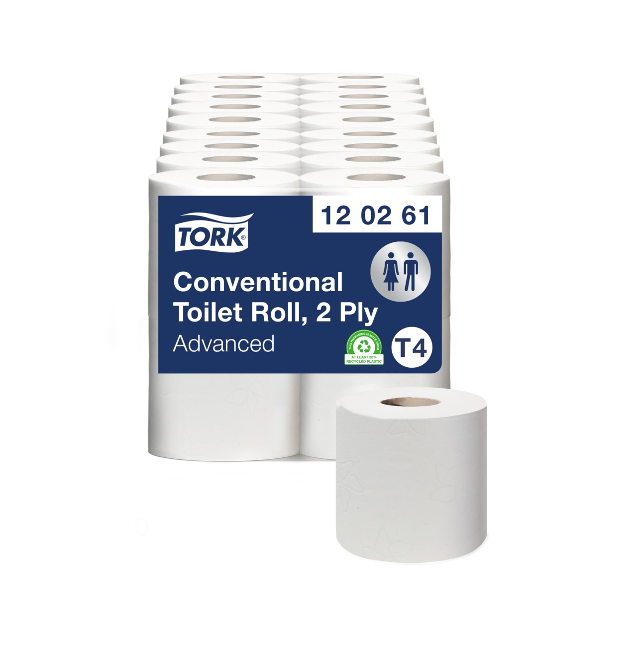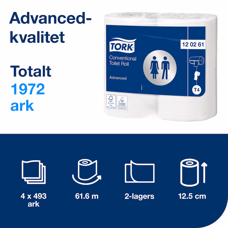 Ge dina besökare samma komfort som hemma med Tork toalettpapper i Advanced-kvalitet. Detta toalettpapper har en effektiv balans mellan kostnad och prestanda för toalettutrymmen med låg besöksfrekvens.